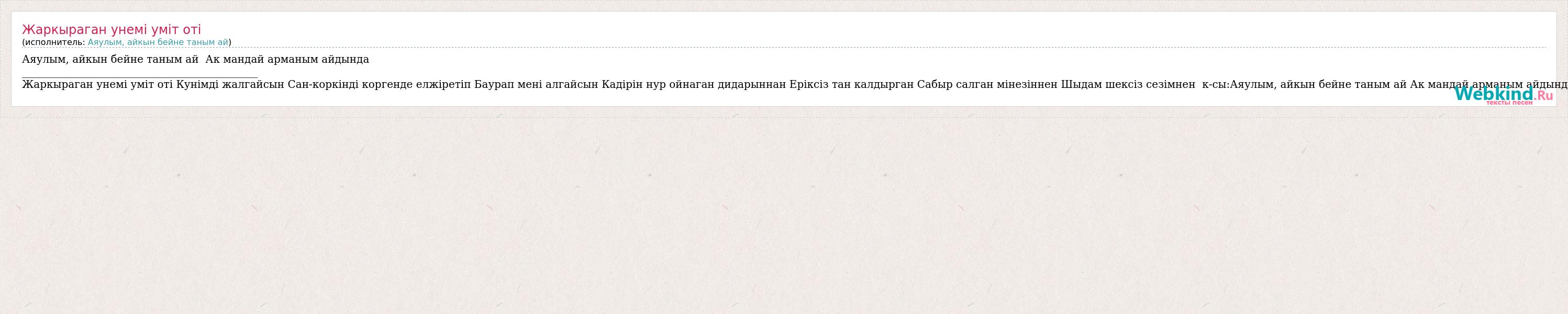 Аяулым, айкын бейне таным ай Ак мандай арманым айдында _____________________________________________ Жаркыраган унемi умiт отi Кунiмдi жалгайсын Сан-коркiндi коргенде елжiретiп Баурап менi алгайсын Кадiрiн нур ойнаган дидарыннан Ерiксiз тан калдырган Сабыр салган мiнезiннен Шыдам шексiз сезiмнен к-сы:Аяулым, айкын бейне таным ай Ак мандай арманым айдынд