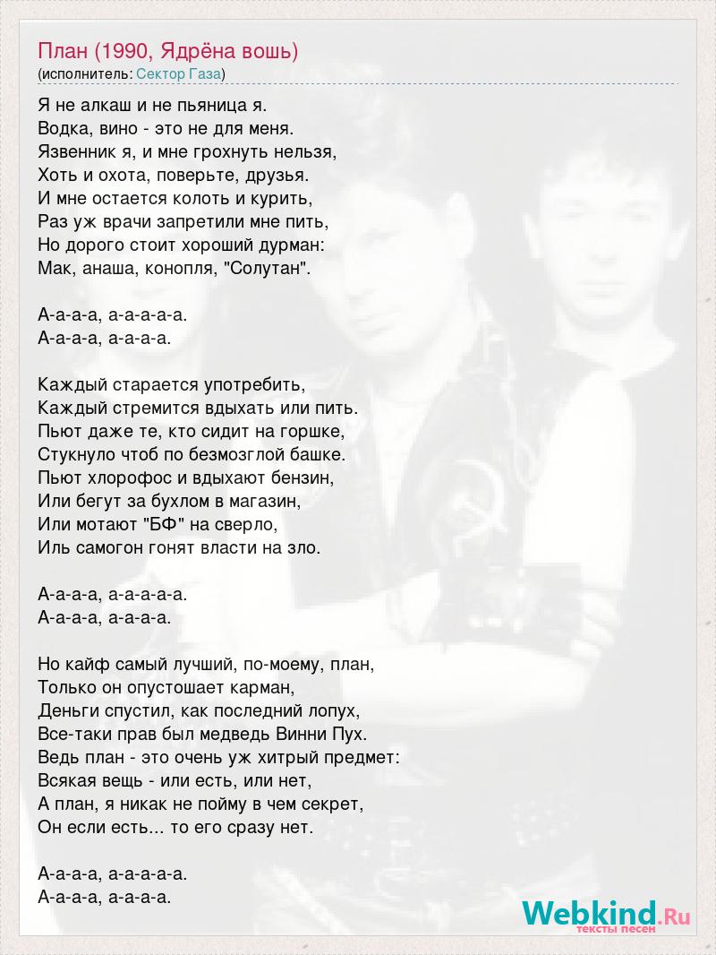 Я не алкаш и не пьяница я. Водка, вино - это не для меня. Язвенник я, и мне грохнуть нельзя, Хоть и охота, поверьте, друзья. И мне остается колоть и курить, Раз уж врачи запретили мне пить, Но дорого стоит хороший дурман: Мак, анаша, конопля, "Солутан". А-а-а-а, а-а-а-а-а. А-а-а-а, а-а-а-а. Каждый старается употребить, Каждый стремится вдыхать или пить. Пьют даже те, кто сидит на горшке, Стукнуло чтоб по безмозглой башке. Пьют хлорофос и вдыхают бензин, Или бегут за бухлом в магазин, Или мотают "БФ" на сверло, Иль самогон гонят власти на зло. А-а-а-а, а-а-а-а-а. А-а-а-а, а-а-а-а. Но кайф самый лучший, по-моему, план, Только он опустошает карман, Деньги спустил, как последний лопух, Все-таки прав был медведь Винни Пух. Ведь план - это очень уж хитрый предмет: Всякая вещь - или есть, или нет, А план, я никак не пойму в чем секрет, Он если есть... то его сразу нет. А-а-а-а, а-а-а-а-а. А-а-а-а, а-а-а-а.