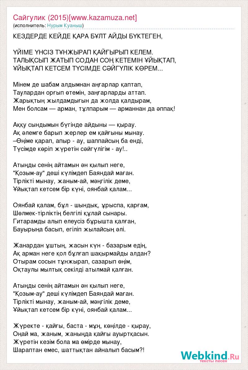 КЕЗДЕРДЕ КЕЙДЕ ҚАРА БҰЛТ АЙДЫ БҮКТЕГЕН, ҮЙІМЕ ҮНСІЗ ТҰНЖЫРАП ҚАЙҒЫРЫП КЕЛЕМ. ТАЛЫҚСЫП ЖАТЫП СОДАН СОҢ КЕТЕМІН ҰЙЫҚТАП, ҰЙЫҚТАП КЕТСЕМ ТҮСІМДЕ СӘЙГҮЛІК КӨРЕМ... Мінем де шабам алдымнан аңғарлар қаптап, Таулардан орғып өтемін, заңғарларды аттап. Жарықтың жылдамдығын да жолда қалдырам, Мен болсам — арман, тұлпарым — арманнан да әппақ! Аққу сындымын бүгінде айдыны — қырау. Ақ әлемге барып жерлер ем қайғыны мынау. –Өңіме қарап, апыр - ау, шаппайсың ба енді, Түсімде көріп жүретін сәйгүлігім - ау!.. Атыңды сенің айтамын ән қылып неге, "Қозым-ау" деші күлімдеп Баяндай маған. Тірлікті мынау, жаным-ай, мәңгілік деме, Ұйықтап кетсем бір күні, оянбай қалам... Оянбай қалам, бұл - шындық, ұрыспа, қарғам, Шөлмек-тірліктің белгілі құлай сынары. Гитарамды алып елеусіз бұрышта қалған, Бауырыңа басып, егіліп жылайсың әлі. Жанардан ұштың, жасын күн - базарым едің, Ақ арман неге қол бұлғап шақырмайды алдан? Отырам сосын тұнжырап, сазарып өңім, Оқтаулы мылтық секілді атылмай қалған. Атыңды сенің айтамын ән қылып неге, "Қозым-ау" деші күлімдеп Баяндай маған. Тірлікті мынау, жаным-ай, мәңгілік деме, Ұйықтап кетсем бір күні, оянбай қалам... Жүректе - қайғы, баста - мұң, көңілде - қырау, Оңай ма, жаным, жаныңда қайғы ауыртқасын. Жүретін кезім бола ма өмірде мынау, Шараптан емес, шаттықтан айналып басым?!