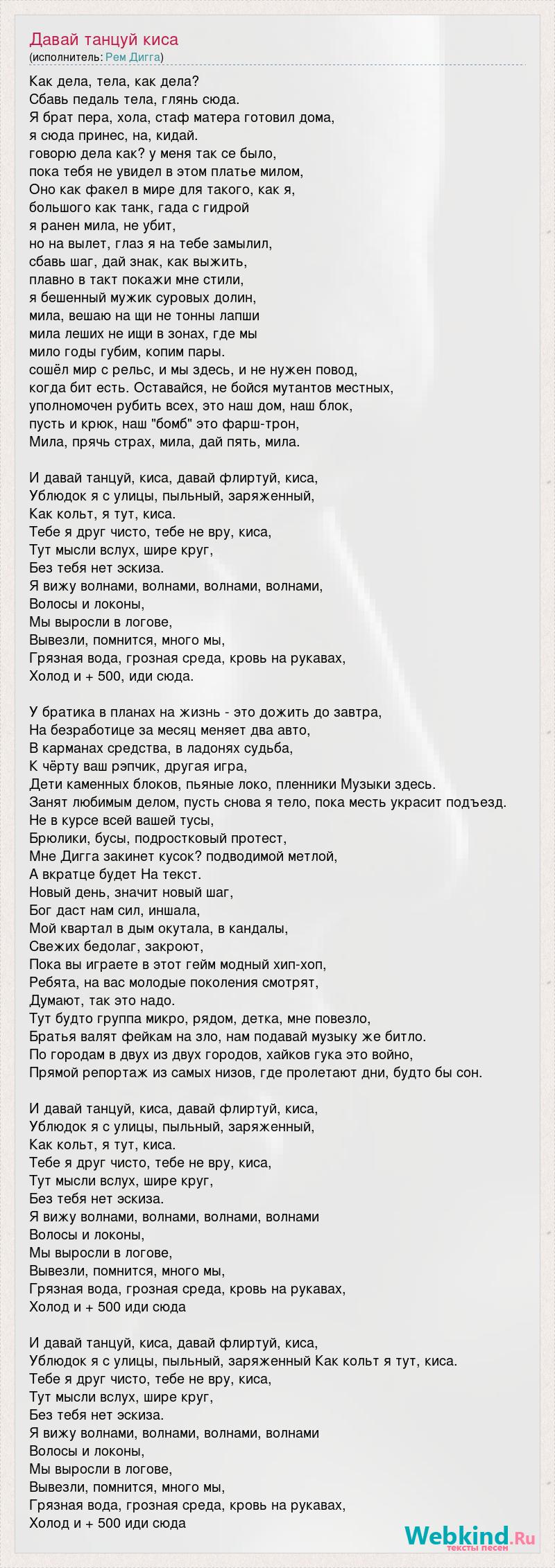 Как дела, тела, как дела? Сбавь педаль тела, глянь сюда. Я брат пера, хола, стаф матера готовил дома, я сюда принес, на, кидай. говорю дела как? у меня так се было, пока тебя не увидел в этом платье милом, Оно как факел в мире для такого, как я, большого как танк, гада с гидрой я ранен мила, не убит, но на вылет, глаз я на тебе замылил, сбавь шаг, дай знак, как выжить, плавно в такт покажи мне стили, я бешенный мужик суровых долин, мила, вешаю на щи не тонны лапши мила леших не ищи в зонах, где мы мило годы губим, копим пары. сошёл мир с рельс, и мы здесь, и не нужен повод, когда бит есть. Оставайся, не бойся мутантов местных, уполномочен рубить всех, это наш дом, наш блок, пусть и крюк, наш "бомб" это фарш-трон, Мила, прячь страх, мила, дай пять, мила. И давай танцуй, киса, давай флиртуй, киса, Ублюдок я с улицы, пыльный, заряженный, Как кольт, я тут, киса. Тебе я друг чисто, тебе не вру, киса, Тут мысли вслух, шире круг, Без тебя нет эскиза. Я вижу волнами, волнами, волнами, волнами, Волосы и локоны, Мы выросли в логове, Вывезли, помнится, много мы, Грязная вода, грозная среда, кровь на рукавах, Холод и + 500, иди сюда. У братика в планах на жизнь - это дожить до завтра, На безработице за месяц меняет два авто, В карманах средства, в ладонях судьба, К чёрту ваш рэпчик, другая игра, Дети каменных блоков, пьяные локо, пленники Музыки здесь. Занят любимым делом, пусть снова я тело, пока месть украсит подъезд. Не в курсе всей вашей тусы, Брюлики, бусы, подростковый протест, Мне Дигга закинет кусок? подводимой метлой, А вкратце будет На текст. Новый день, значит новый шаг, Бог даст нам сил, иншала, Мой квартал в дым окутала, в кандалы, Свежих бедолаг, закроют, Пока вы играете в этот гейм модный хип-хоп, Ребята, на вас молодые поколения смотрят, Думают, так это надо. Тут будто группа микро, рядом, детка, мне повезло, Братья валят фейкам на зло, нам подавай музыку же битло. По городам в двух из двух городов, хайков гука это войно, Прямой репортаж из самых низов, где пролетают дни, будто бы сон. И давай танцуй, киса, давай флиртуй, киса, Ублюдок я с улицы, пыльный, заряженный, Как кольт, я тут, киса. Тебе я друг чисто, тебе не вру, киса, Тут мысли вслух, шире круг, Без тебя нет эскиза. Я вижу волнами, волнами, волнами, волнами Волосы и локоны, Мы выросли в логове, Вывезли, помнится, много мы, Грязная вода, грозная среда, кровь на рукавах, Холод и + 500 иди сюда И давай танцуй, киса, давай флиртуй, киса, Ублюдок я с улицы, пыльный, заряженный Как кольт я тут, киса. Тебе я друг чисто, тебе не вру, киса, Тут мысли вслух, шире круг, Без тебя нет эскиза. Я вижу волнами, волнами, волнами, волнами Волосы и локоны, Мы выросли в логове, Вывезли, помнится, много мы, Грязная вода, грозная среда, кровь на рукавах, Холод и + 500 иди сюда