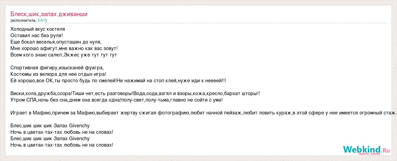 Холодный вкус коктеля Оставил нас без руля! Еще бокал веселья,опусташен до нуля, Мне хорошо афигут,мне важно как вас зовут! Всем кого знаю салют,Экжес уже тут тут тут Спортивная фигиру,изысканей фуагра, Костюмы из велюра для нее отдых-игра! Ей хорошо,все ОК,ты просто будь по смелей!Не нажимай на стоп клей,нуже иди к неееей!!! Виски,кола,дружба,ссора!Тиши нет,есть разговоры!Вода,сода,взгял и взоры,кожа,кресло,бархат шторы!! Утром СПА,ночь без сна,днем она всегда одна!полу-свет,полу-тьма,главно не сойти с ума! Играет в Мафию,причем за Мафию,выбирает жертву сжигая фотографию,любит начной пейзаж,любит ловить кураж,в этой сфере у нее имеется огромный стаж. Блес,шик шик шик Запах Givenchy Ночь в цветах-тах-тах любовь не на словах! Блес,шик шик шик Запах Givenchy Ночь в цветах-тах-тах любовь не на словах!