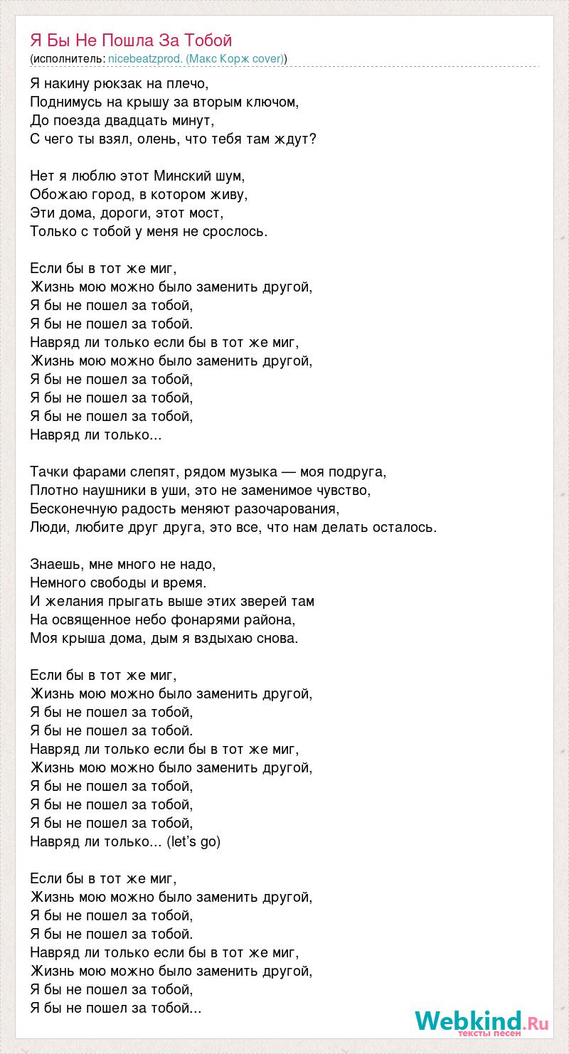 Я накину рюкзак на плечо, Поднимусь на крышу за вторым ключом, До поезда двадцать минут, С чего ты взял, олень, что тебя там ждут? Нет я люблю этот Минский шум, Обожаю город, в котором живу, Эти дома, дороги, этот мост, Только с тобой у меня не срослось. Если бы в тот же миг, Жизнь мою можно было заменить другой, Я бы не пошел за тобой, Я бы не пошел за тобой. Навряд ли только если бы в тот же миг, Жизнь мою можно было заменить другой, Я бы не пошел за тобой, Я бы не пошел за тобой, Я бы не пошел за тобой, Навряд ли только... Тачки фарами слепят, рядом музыка — моя подруга, Плотно наушники в уши, это не заменимое чувство, Бесконечную радость меняют разочарования, Люди, любите друг друга, это все, что нам делать осталось. Знаешь, мне много не надо, Немного свободы и время. И желания прыгать выше этих зверей там На освященное небо фонарями района, Моя крыша дома, дым я вздыхаю снова. Если бы в тот же миг, Жизнь мою можно было заменить другой, Я бы не пошел за тобой, Я бы не пошел за тобой. Навряд ли только если бы в тот же миг, Жизнь мою можно было заменить другой, Я бы не пошел за тобой, Я бы не пошел за тобой, Я бы не пошел за тобой, Навряд ли только... (let’s go) Если бы в тот же миг, Жизнь мою можно было заменить другой, Я бы не пошел за тобой, Я бы не пошел за тобой. Навряд ли только если бы в тот же миг, Жизнь мою можно было заменить другой, Я бы не пошел за тобой, Я бы не пошел за тобой...