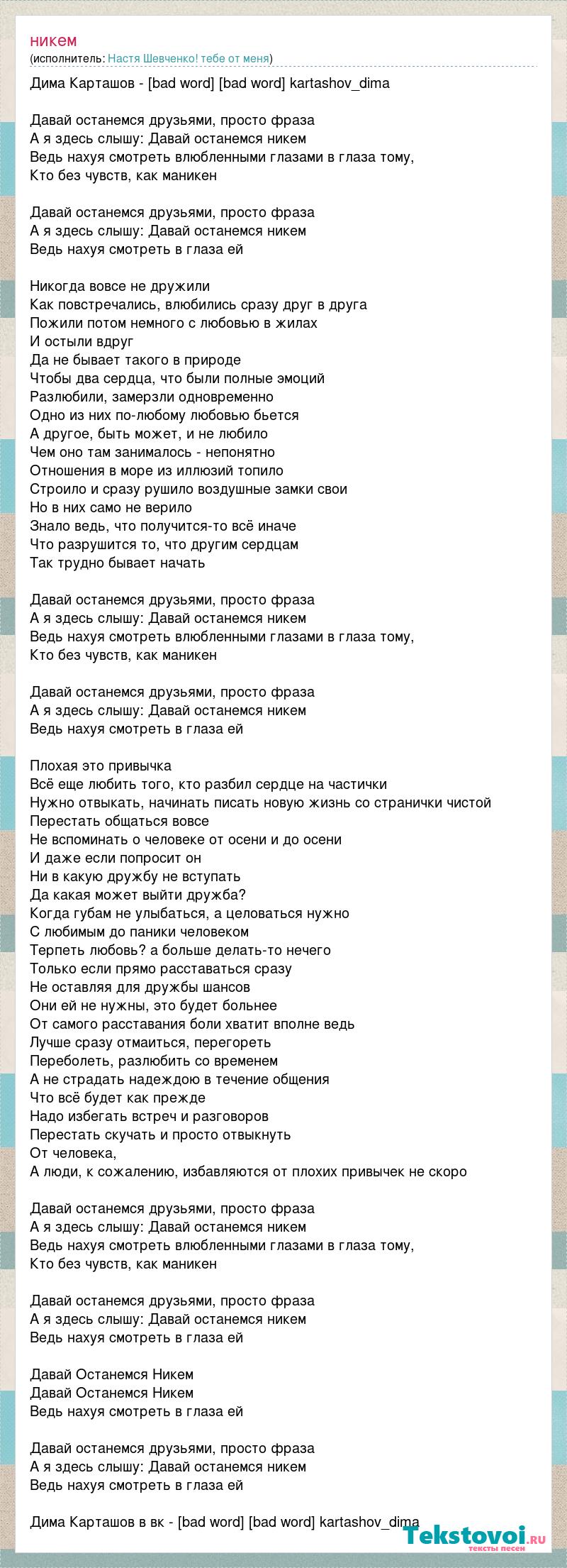 Дима Карташов - [bad word] [bad word] kartashov_dima Давай останемся друзьями, просто фраза А я здесь слышу: Давай останемся никем Ведь нахуя смотреть влюбленными глазами в глаза тому, Кто без чувств, как маникен Давай останемся друзьями, просто фраза А я здесь слышу: Давай останемся никем Ведь нахуя смотреть в глаза ей Никогда вовсе не дружили Как повстречались, влюбились сразу друг в друга Пожили потом немного с любовью в жилах И остыли вдруг Да не бывает такого в природе Чтобы два сердца, что были полные эмоций Разлюбили, замерзли одновременно Одно из них по-любому любовью бьется А другое, быть может, и не любило Чем оно там занималось - непонятно Отношения в море из иллюзий топило Строило и сразу рушило воздушные замки свои Но в них само не верило Знало ведь, что получится-то всё иначе Что разрушится то, что другим сердцам Так трудно бывает начать Давай останемся друзьями, просто фраза А я здесь слышу: Давай останемся никем Ведь нахуя смотреть влюбленными глазами в глаза тому, Кто без чувств, как маникен Давай останемся друзьями, просто фраза А я здесь слышу: Давай останемся никем Ведь нахуя смотреть в глаза ей Плохая это привычка Всё еще любить того, кто разбил сердце на частички Нужно отвыкать, начинать писать новую жизнь со странички чистой Перестать общаться вовсе Не вспоминать о человеке от осени и до осени И даже если попросит он Ни в какую дружбу не вступать Да какая может выйти дружба? Когда губам не улыбаться, а целоваться нужно С любимым до паники человеком Терпеть любовь? а больше делать-то нечего Только если прямо расставаться сразу Не оставляя для дружбы шансов Они ей не нужны, это будет больнее От самого расставания боли хватит вполне ведь Лучше сразу отмаиться, перегореть Переболеть, разлюбить со временем А не страдать надеждою в течение общения Что всё будет как прежде Надо избегать встреч и разговоров Перестать скучать и просто отвыкнуть От человека, А люди, к сожалению, избавляются от плохих привычек не скоро Давай останемся друзьями, просто фраза А я здесь слышу: Давай останемся никем Ведь нахуя смотреть влюбленными глазами в глаза тому, Кто без чувств, как маникен Давай останемся друзьями, просто фраза А я здесь слышу: Давай останемся никем Ведь нахуя смотреть в глаза ей Давай Останемся Никем Давай Останемся Никем Ведь нахуя смотреть в глаза ей Давай останемся друзьями, просто фраза А я здесь слышу: Давай останемся никем Ведь нахуя смотреть в глаза ей Дима Карташов в вк - [bad word] [bad word] kartashov_dima
