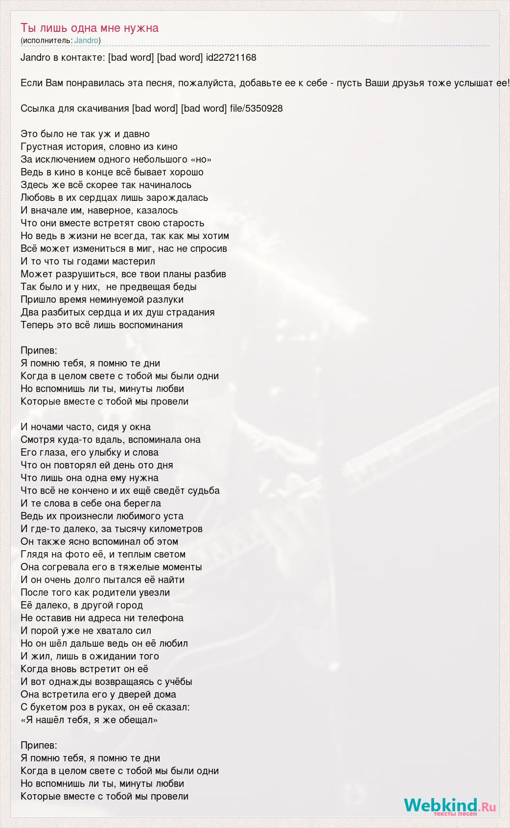 Jandro в контакте: [bad word] [bad word] id22721168 Если Вам понравилась эта песня, пожалуйста, добавьте ее к себе - пусть Ваши друзья тоже услышат ее! Ссылка для скачивания [bad word] [bad word] file/5350928 Это было не так уж и давно Грустная история, словно из кино За исключением одного небольшого «но» Ведь в кино в конце всё бывает хорошо Здесь же всё скорее так начиналось Любовь в их сердцах лишь зарождалась И вначале им, наверное, казалось Что они вместе встретят свою старость Но ведь в жизни не всегда, так как мы хотим Всё может измениться в миг, нас не спросив И то что ты годами мастерил Может разрушиться, все твои планы разбив Так было и у них, не предвещая беды Пришло время неминуемой разлуки Два разбитых сердца и их душ страдания Теперь это всё лишь воспоминания Припев: Я помню тебя, я помню те дни Когда в целом свете с тобой мы были одни Но вспомнишь ли ты, минуты любви Которые вместе с тобой мы провели И ночами часто, сидя у окна Смотря куда-то вдаль, вспоминала она Его глаза, его улыбку и слова Что он повторял ей день ото дня Что лишь она одна ему нужна Что всё не кончено и их ещё сведёт судьба И те слова в себе она берегла Ведь их произнесли любимого уста И где-то далеко, за тысячу километров Он также ясно вспоминал об этом Глядя на фото её, и теплым светом Она согревала его в тяжелые моменты И он очень долго пытался её найти После того как родители увезли Её далеко, в другой город Не оставив ни адреса ни телефона И порой уже не хватало сил Но он шёл дальше ведь он её любил И жил, лишь в ожидании того Когда вновь встретит он её И вот однажды возвращаясь с учёбы Она встретила его у дверей дома С букетом роз в руках, он её сказал: «Я нашёл тебя, я же обещал» Припев: Я помню тебя, я помню те дни Когда в целом свете с тобой мы были одни Но вспомнишь ли ты, минуты любви Которые вместе с тобой мы провели