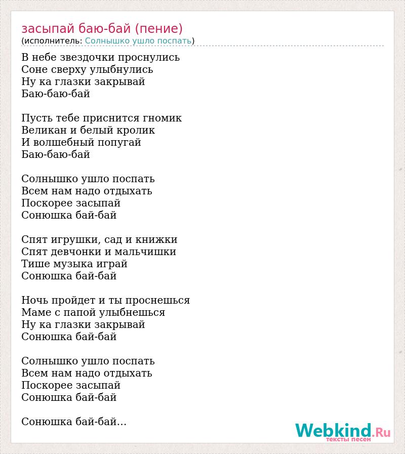 В небе звездочки проснулись Соне сверху улыбнулись Ну ка глазки закрывай Баю-баю-бай Пусть тебе приснится гномик Великан и белый кролик И волшебный попугай Баю-баю-бай Солнышко ушло поспать Всем нам надо отдыхать Поскорее засыпай Сонюшка бай-бай Спят игрушки, сад и книжки Спят девчонки и мальчишки Тише музыка играй Сонюшка бай-бай Ночь пройдет и ты проснешься Маме с папой улыбнешься Ну ка глазки закрывай Сонюшка бай-бай Солнышко ушло поспать Всем нам надо отдыхать Поскорее засыпай Сонюшка бай-бай Сонюшка бай-бай…