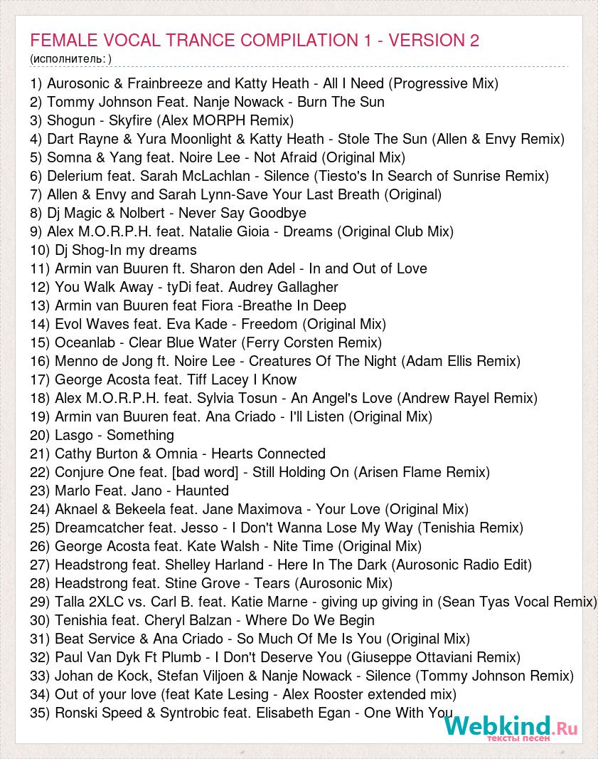 Главная→Исполнители→FEMALE VOCAL TRANCE COMPILATION 1 - VERSION 2 Track→FEMALE VOCAL TRANCE COMPILATION 1 - VERSION 2