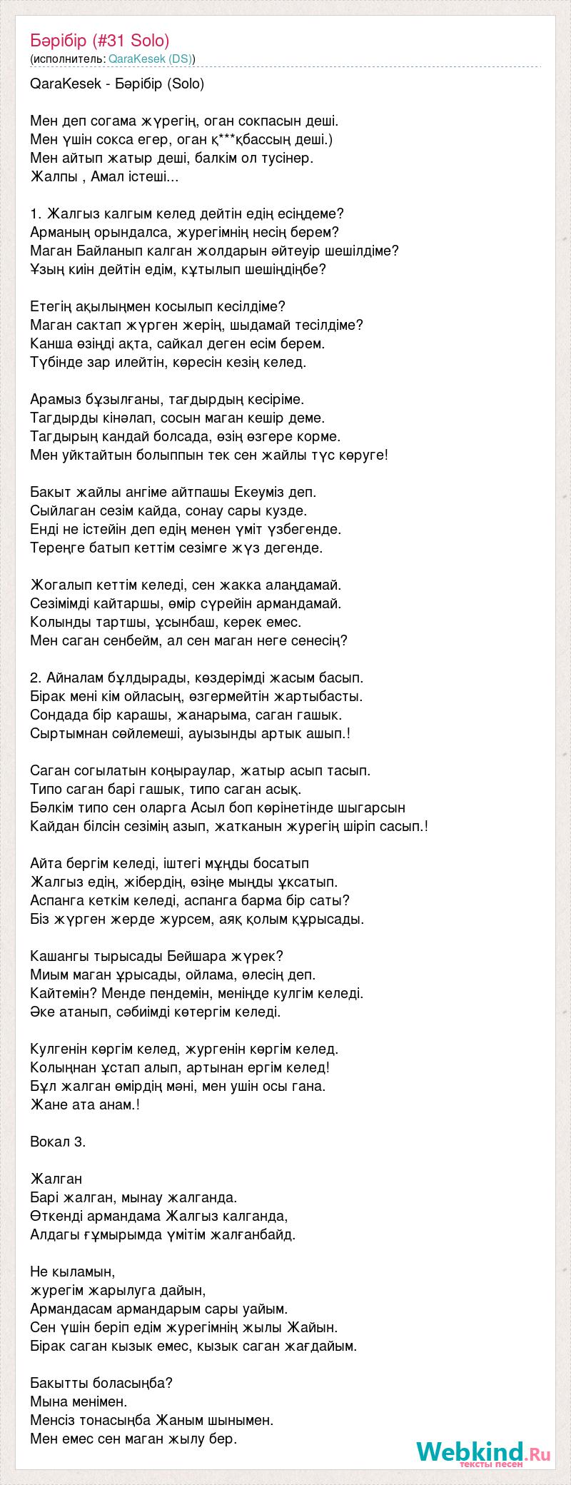 QaraKesek - Бәрібір (Solo) Мен деп согама жүрегің, оган сокпасын деші. Мен үшін сокса егер, оган қ***қбассың деші.) Мен айтып жатыр деші, балкім ол тусінер. Жалпы , Амал істеші... 1. Жалгыз калгым келед дейтін едің есіңдеме? Арманың орындалса, журегімнің несің берем? Маган Байланып калган жолдарын әйтеуір шешілдіме? Ұзың киін дейтін едім, кұтылып шешіңдіңбе? Етегің ақылыңмен косылып кесілдіме? Маган сактап жүрген жерің, шыдамай тесілдіме? Канша өзіңді ақта, сайкал деген есім берем. Түбінде зар илейтін, көресін кезің келед. Арамыз бұзылғаны, тағдырдың кесіріме. Тагдырды кінәлап, сосын маган кешір деме. Тагдырың кандай болсада, өзің өзгере корме. Мен уйктайтын болыппын тек сен жайлы түс көруге! Бакыт жайлы ангіме айтпашы Екеуміз деп. Сыйлаган сезім кайда, сонау сары кузде. Енді не істейін деп едің менен үміт үзбегенде. Тереңге батып кеттім сезімге жүз дегенде. Жогалып кеттім келеді, сен жакка алаңдамай. Сезімімді кайтаршы, өмір сүрейін армандамай. Колынды тартшы, ұсынбаш, керек емес. Мен саган сенбейм, ал сен маган неге сенесің? 2. Айналам бұлдырады, көздерімді жасым басып. Бірак мені кім ойласың, өзгермейтін жартыбасты. Сондада бір карашы, жанарыма, саган гашык. Сыртымнан сөйлемеші, ауызынды артык ашып.! Саган согылатын коңыраулар, жатыр асып тасып. Типо саган барі гашык, типо саган асық. Бәлкім типо сен оларга Асыл боп көрінетінде шыгарсын Кайдан білсін сезімің азып, жатканын журегің шіріп сасып.! Айта бергім келеді, іштегі мұңды босатып Жалгыз едің, жібердің, өзіңе мыңды ұксатып. Аспанга кеткім келеді, аспанга барма бір саты? Біз жүрген жерде журсем, аяқ қолым құрысады. Кашангы тырысады Бейшара жүрек? Миым маган ұрысады, ойлама, өлесің деп. Кайтемін? Менде пендемін, меніңде кулгім келеді. Әке атанып, сәбиімді көтергім келеді. Кулгенін көргім келед, жургенін көргім келед. Колыңнан ұстап алып, артынан ергім келед! Бұл жалган өмірдің мәні, мен ушін осы гана. Жане ата анам.! Вокал 3. Жалган Барі жалган, мынау жалганда. Өткенді армандама Жалгыз калганда, Алдагы ғұмырымда үмітім жалғанбайд. Не кыламын, журегім жарылуга дайын, Армандасам армандарым сары уайым. Сен үшін беріп едім журегімнің жылы Жайын. Бірак саган кызык емес, кызык саган жағдайым. Бакытты боласыңба? Мына менімен. Менсіз тонасыңба Жаным шынымен. Мен емес сен маган жылу бер.