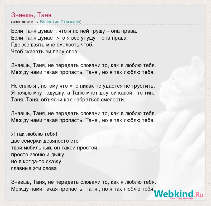 Если Таня думает, что я по ней грущу – она права. Если Таня думает,что я все упущу – она права. Где же взять мне смелость чтоб, Чтоб сказать ей пару слов. Знаешь, Таня, не передать словами то, как я люблю тебя. Между нами такая пропасть, Таня , но я так люблю тебя. Не сплю я , потому что мне никак не удается не грустить. Я ночью мну подушку, а Таню мнет другой какой - то тип. Таня, Таня, объясни как набраться смелости. Знаешь, Таня, не передать словами то, как я люблю тебя. Между нами такая пропасть, Таня , но я так люблю тебя. Я так люблю тебя! две семёрки девяносто сто твой мобильный, он такой простой просто звоню и дышу но я когда-то скажу главные эти слова Знаешь, Таня, не передать словами то, как я люблю тебя. Между нами такая пропасть, Таня , но я так люблю тебя.