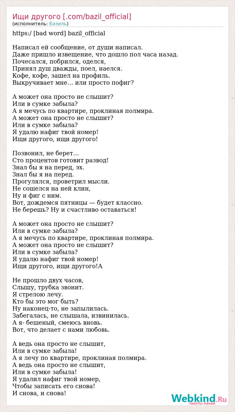 https:/ [bad word] bazil_official Написал ей сообщение, от души написал. Даже пришло извещение, что дошло пол часа назад. Почесался, побрился, оделся, Принял душ дважды, поел, наелся. Кофе, кофе, зашел на профиль. Выкручивает мне… или просто пофиг? А может она просто не слышит? Или в сумке забыла? А я мечусь по квартире, проклиная полмира. А может она просто не слышит? Или в сумке забыла? Я удалю нафиг твой номер! Ищи другого, ищи другого! Позвонил, не берет… Сто процентов готовит развод! Знал бы я на перед, эх. Знал бы я на перед. Прогулялся, проветрил мысли. Не сошелся на ней клин, Ну и фиг с ним. Вот, дождемся пятницы — будет классно. Не берешь? Ну и счастливо оставаться! А может она просто не слышит? Или в сумке забыла? А я мечусь по квартире, проклиная полмира. А может она просто не слышит? Или в сумке забыла? Я удалю нафиг твой номер! Ищи другого, ищи другого!А Не прошло двух часов, Слышу, трубка звонит. Я стрелою лечу. Кто бы это мог быть? Ну наконец-то, не запылилась. Забегалась, не слышала, извинилась. А я- бешеный, смеюсь вновь. Вот, что делает с нами любовь. А ведь она просто не слышит, Или в сумке забыла! А я лечу по квартире, проклиная полмира. А ведь она просто не слышит, Или в сумке забыла! Я удалил нафиг твой номер, Чтобы записать его снова! И снова, и снова!