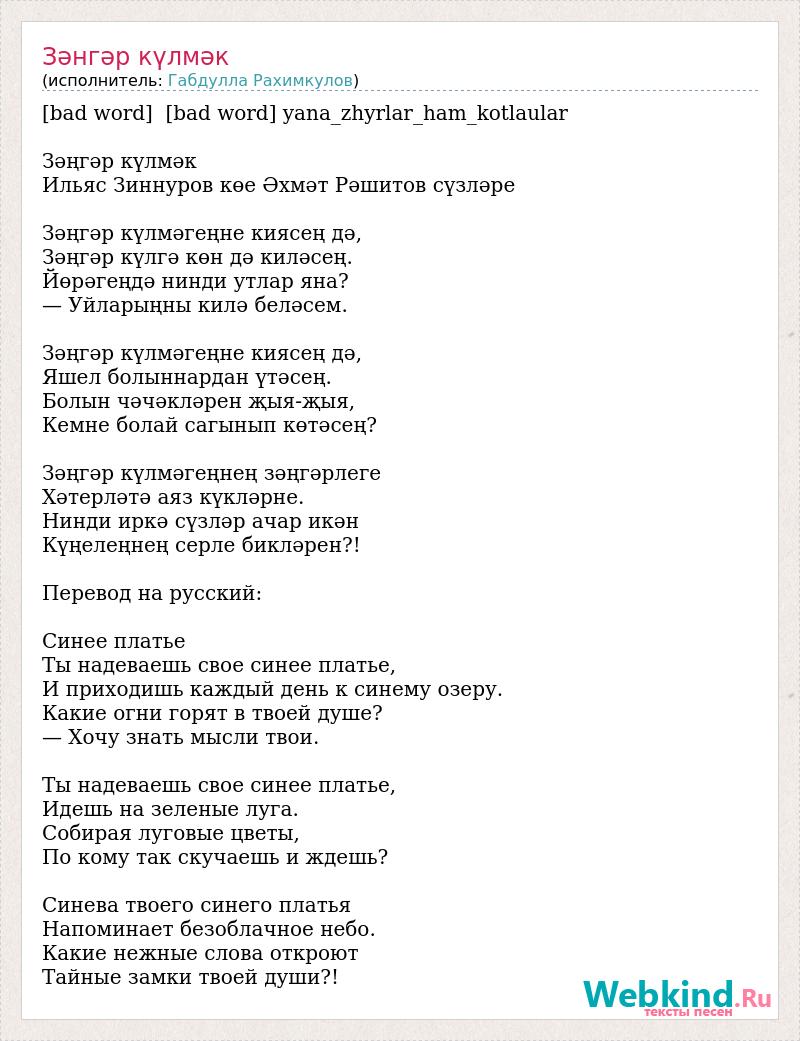 [bad word] [bad word] yana_zhyrlar_ham_kotlaular Зәңгәр күлмәк Ильяс Зиннуров көе Әхмәт Рәшитов сүзләре Зәңгәр күлмәгеңне киясең дә, Зәңгәр күлгә көн дә киләсең. Йөрәгеңдә нинди утлар яна? — Уйларыңны килә беләсем. Зәңгәр күлмәгеңне киясең дә, Яшел болыннардан үтәсең. Болын чәчәкләрен җыя-җыя, Кемне болай сагынып көтәсең? Зәңгәр күлмәгеңнең зәңгәрлеге Хәтерләтә аяз күкләрне. Нинди иркә сүзләр ачар икән Күңелеңнең серле бикләрен?! Перевод на русский: Синее платье Ты надеваешь свое синее платье, И приходишь каждый день к синему озеру. Какие огни горят в твоей душе? — Хочу знать мысли твои. Ты надеваешь свое синее платье, Идешь на зеленые луга. Собирая луговые цветы, По кому так скучаешь и ждешь? Синева твоего синего платья Напоминает безоблачное небо. Какие нежные слова откроют Тайные замки твоей души?!