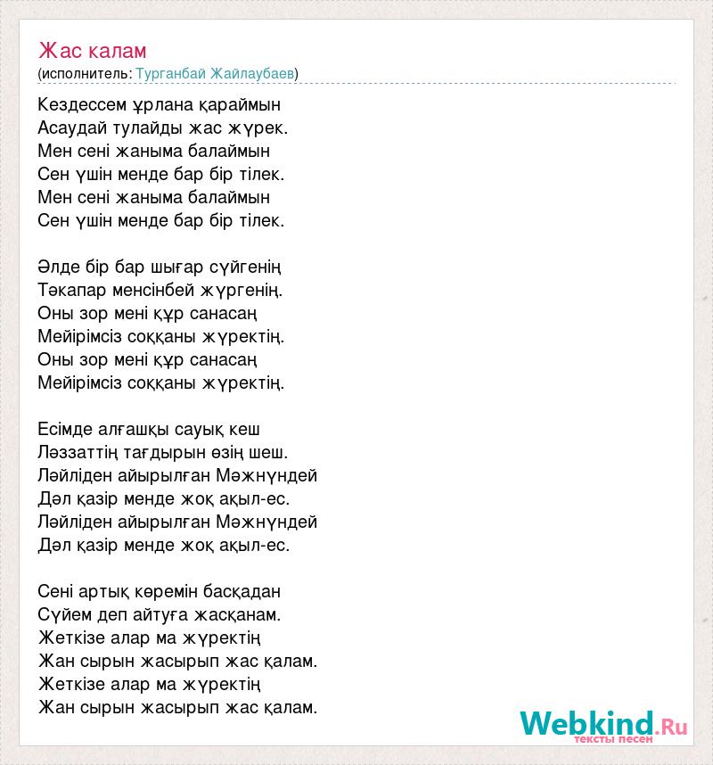 Кездессем ұрлана қараймын Асаудай тулайды жас жүрек. Мен сені жаныма балаймын Сен үшін менде бар бір тілек. Мен сені жаныма балаймын Сен үшін менде бар бір тілек. Әлде бір бар шығар сүйгенің Тәкапар менсінбей жүргенің. Оны зор мені құр санасаң Мейірімсіз соққаны жүректің. Оны зор мені құр санасаң Мейірімсіз соққаны жүректің. Есімде алғашқы сауық кеш Ләззаттің тағдырын өзің шеш. Ләйліден айырылған Мәжнүндей Дәл қазір менде жоқ ақыл-ес. Ләйліден айырылған Мәжнүндей Дәл қазір менде жоқ ақыл-ес. Сені артық көремін басқадан Сүйем деп айтуға жасқанам. Жеткізе алар ма жүректің Жан сырын жасырып жас қалам. Жеткізе алар ма жүректің Жан сырын жасырып жас қалам.