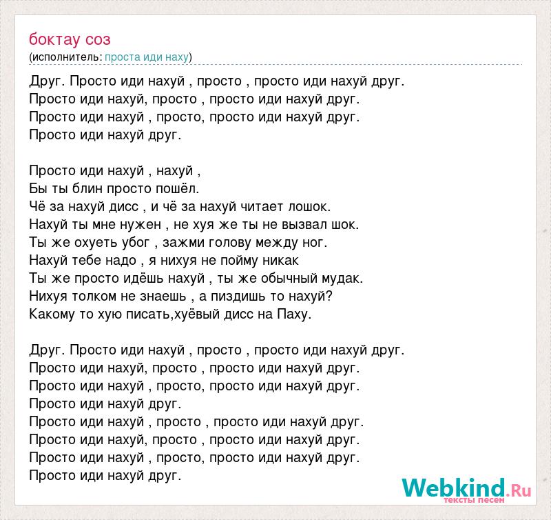 Друг. Просто иди нахуй , просто , просто иди нахуй друг. Просто иди нахуй, просто , просто иди нахуй друг. Просто иди нахуй , просто, просто иди нахуй друг. Просто иди нахуй друг. Просто иди нахуй , нахуй , Бы ты блин просто пошёл. Чё за нахуй дисс , и чё за нахуй читает лошок. Нахуй ты мне нужен , не хуя же ты не вызвал шок. Ты же охуеть убог , зажми голову между ног. Нахуй тебе надо , я нихуя не пойму никак Ты же просто идёшь нахуй , ты же обычный мудак. Нихуя толком не знаешь , а пиздишь то нахуй? Какому то хую писать,хуёвый дисс на Паху. Друг. Просто иди нахуй , просто , просто иди нахуй друг. Просто иди нахуй, просто , просто иди нахуй друг. Просто иди нахуй , просто, просто иди нахуй друг. Просто иди нахуй друг. Просто иди нахуй , просто , просто иди нахуй друг. Просто иди нахуй, просто , просто иди нахуй друг. Просто иди нахуй , просто, просто иди нахуй друг. Просто иди нахуй друг.