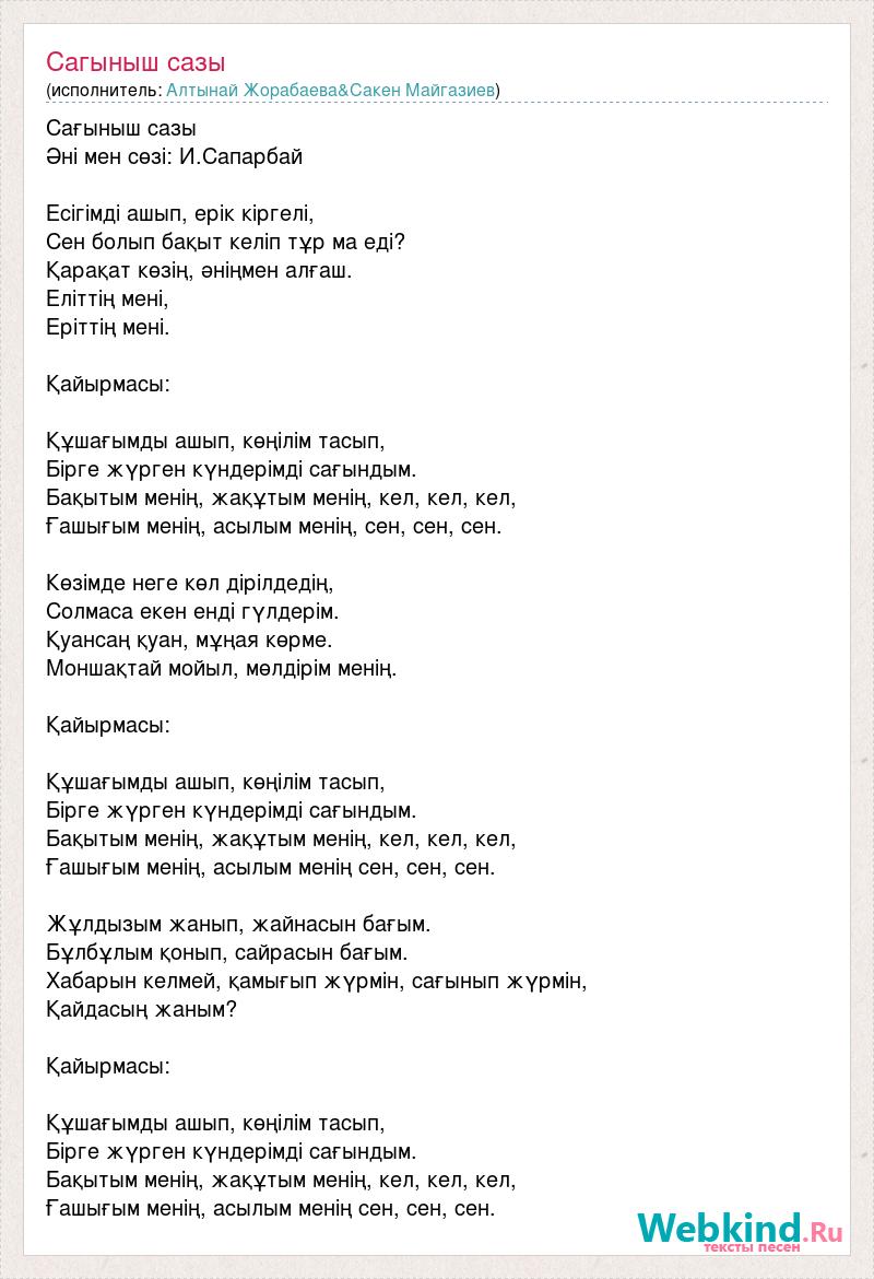 Сағыныш сазы Әні мен сөзі: И.Сапарбай Есігімді ашып, ерік кіргелі, Сен болып бақыт келіп тұр ма еді? Қарақат көзің, әніңмен алғаш. Еліттің мені, Еріттің мені. Қайырмасы: Құшағымды ашып, көңілім тасып, Бірге жүрген күндерімді сағындым. Бақытым менің, жақұтым менің, кел, кел, кел, Ғашығым менің, асылым менің, сен, сен, сен. Көзімде неге көл дірілдедің, Солмаса екен енді гүлдерім. Қуансаң қуан, мұңая көрме. Моншақтай мойыл, мөлдірім менің. Қайырмасы: Құшағымды ашып, көңілім тасып, Бірге жүрген күндерімді сағындым. Бақытым менің, жақұтым менің, кел, кел, кел, Ғашығым менің, асылым менің сен, сен, сен. Жұлдызым жанып, жайнасын бағым. Бұлбұлым қонып, сайрасын бағым. Хабарын келмей, қамығып жүрмін, сағынып жүрмін, Қайдасың жаным? Қайырмасы: Құшағымды ашып, көңілім тасып, Бірге жүрген күндерімді сағындым. Бақытым менің, жақұтым менің, кел, кел, кел, Ғашығым менің, асылым менің сен, сен, сен.