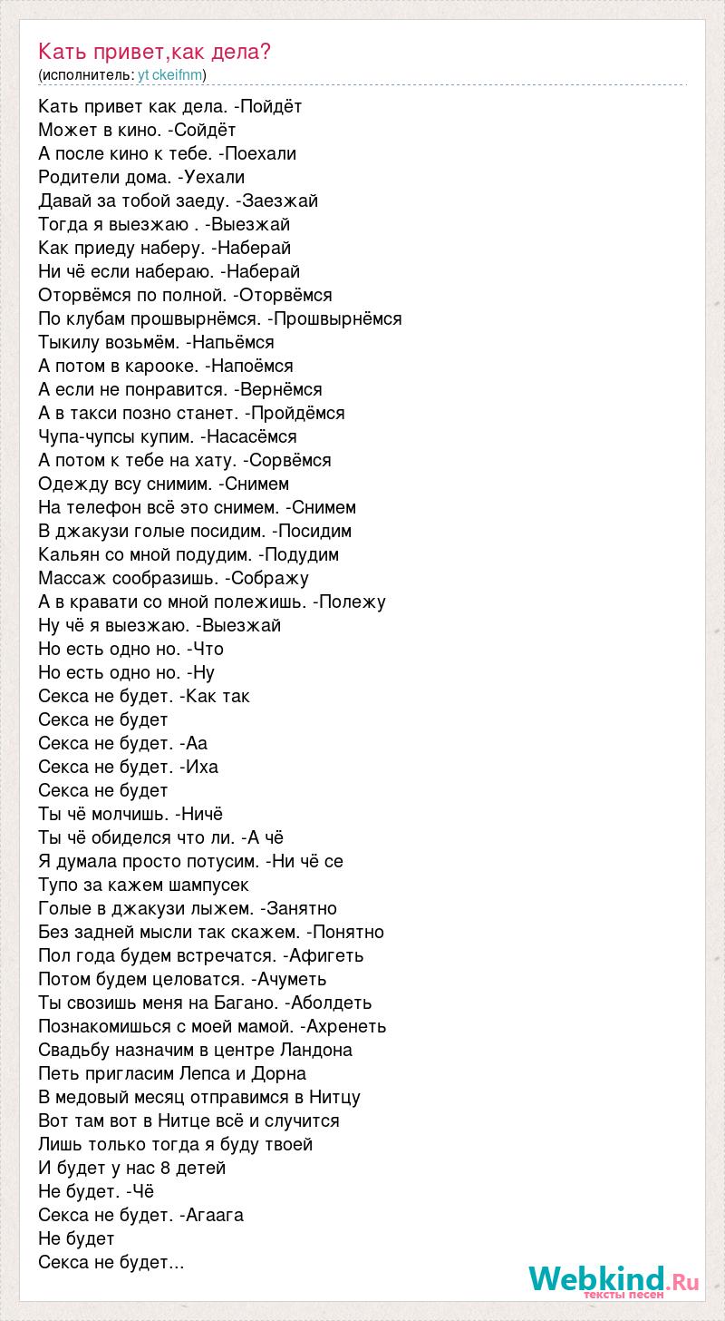 Кать привет как дела. -Пойдёт Может в кино. -Сойдёт А после кино к тебе. -Поехали Родители дома. -Уехали Давай за тобой заеду. -Заезжай Тогда я выезжаю . -Выезжай Как приеду наберу. -Наберай Ни чё если набераю. -Наберай Оторвёмся по полной. -Оторвёмся По клубам прошвырнёмся. -Прошвырнёмся Тыкилу возьмём. -Напьёмся А потом в карооке. -Напоёмся А если не понравится. -Вернёмся А в такси позно станет. -Пройдёмся Чупа-чупсы купим. -Насасёмся А потом к тебе на хату. -Сорвёмся Одежду всу снимим. -Снимем На телефон всё это снимем. -Снимем В джакузи голые посидим. -Посидим Кальян со мной подудим. -Подудим Массаж сообразишь. -Сображу А в кравати со мной полежишь. -Полежу Ну чё я выезжаю. -Выезжай Но есть одно но. -Что Но есть одно но. -Ну Секса не будет. -Как так Секса не будет Секса не будет. -Аа Секса не будет. -Иха Секса не будет Ты чё молчишь. -Ничё Ты чё обиделся что ли. -А чё Я думала просто потусим. -Ни чё се Тупо за кажем шампусек Голые в джакузи лыжем. -Занятно Без задней мысли так скажем. -Понятно Пол года будем встречатся. -Афигеть Потом будем целоватся. -Ачуметь Ты свозишь меня на Багано. -Аболдеть Познакомишься с моей мамой. -Ахренеть Свадьбу назначим в центре Ландона Петь пригласим Лепса и Дорна В медовый месяц отправимся в Нитцу Вот там вот в Нитце всё и случится Лишь только тогда я буду твоей И будет у нас 8 детей Не будет. -Чё Секса не будет. -Агаага Не будет Секса не будет...