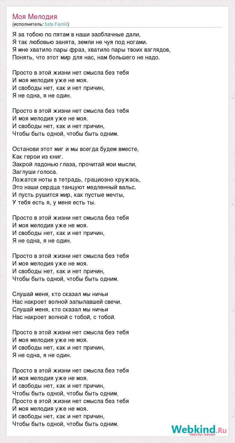 Я за тобою по пятам в наши заоблачные дали, Я так любовью занята, земли не чуя под ногами. Я мне хватило пары фраз, хватило пары твоих взглядов, Понять, что этот мир для нас, нам большего не надо. Просто в этой жизни нет смысла без тебя И моя мелодия уже не моя. И свободы нет, как и нет причин, Я не одна, я не один. Просто в этой жизни нет смысла без тебя И моя мелодия уже не моя. И свободы нет, как и нет причин, Чтобы быть одной, чтобы быть одним. Останови этот миг и мы всегда будем вместе, Как герои из книг. Закрой ладонью глаза, прочитай мои мысли, Заглуши голоса. Ложатся ноты в тетрадь, грациозно кружась, Это наши сердца танцуют медленный вальс. И пусть рушится мир, как пустые мечты, У тебя есть я, у меня есть ты. Просто в этой жизни нет смысла без тебя И моя мелодия уже не моя. И свободы нет, как и нет причин, Я не одна, я не один. Просто в этой жизни нет смысла без тебя И моя мелодия уже не моя. И свободы нет, как и нет причин, Чтобы быть одной, чтобы быть одним. Слушай меня, кто сказал мы ничьи Нас накроет волной запылавшей свечи. Слушай меня, кто сказал мы ничьи Нас накроет волной с тобой, с тобой. Просто в этой жизни нет смысла без тебя И моя мелодия уже не моя. И свободы нет, как и нет причин, Я не одна, я не один. Просто в этой жизни нет смысла без тебя И моя мелодия уже не моя. И свободы нет, как и нет причин, Чтобы быть одной, чтобы быть одним. Просто в этой жизни нет смысла без тебя И моя мелодия уже не моя. И свободы нет, как и нет причин, Чтобы быть одной, чтобы быть одним.