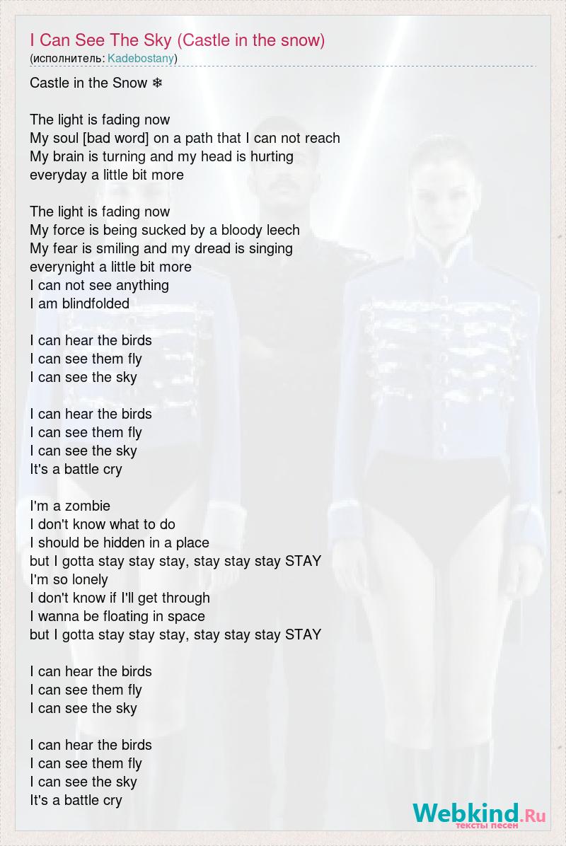 Castle in the Snow ❄ The light is fading now My soul [bad word] on a path that I can not reach My brain is turning and my head is hurting everyday a little bit more The light is fading now My force is being sucked by a bloody leech My fear is smiling and my dread is singing everynight a little bit more I can not see anything I am blindfolded I can hear the birds I can see them fly I can see the sky I can hear the birds I can see them fly I can see the sky It's a battle cry I'm a zombie I don't know what to do I should be hidden in a place but I gotta stay stay stay, stay stay stay STAY I'm so lonely I don't know if I'll get through I wanna be floating in space but I gotta stay stay stay, stay stay stay STAY I can hear the birds I can see them fly I can see the sky I can hear the birds I can see them fly I can see the sky It's a battle cry