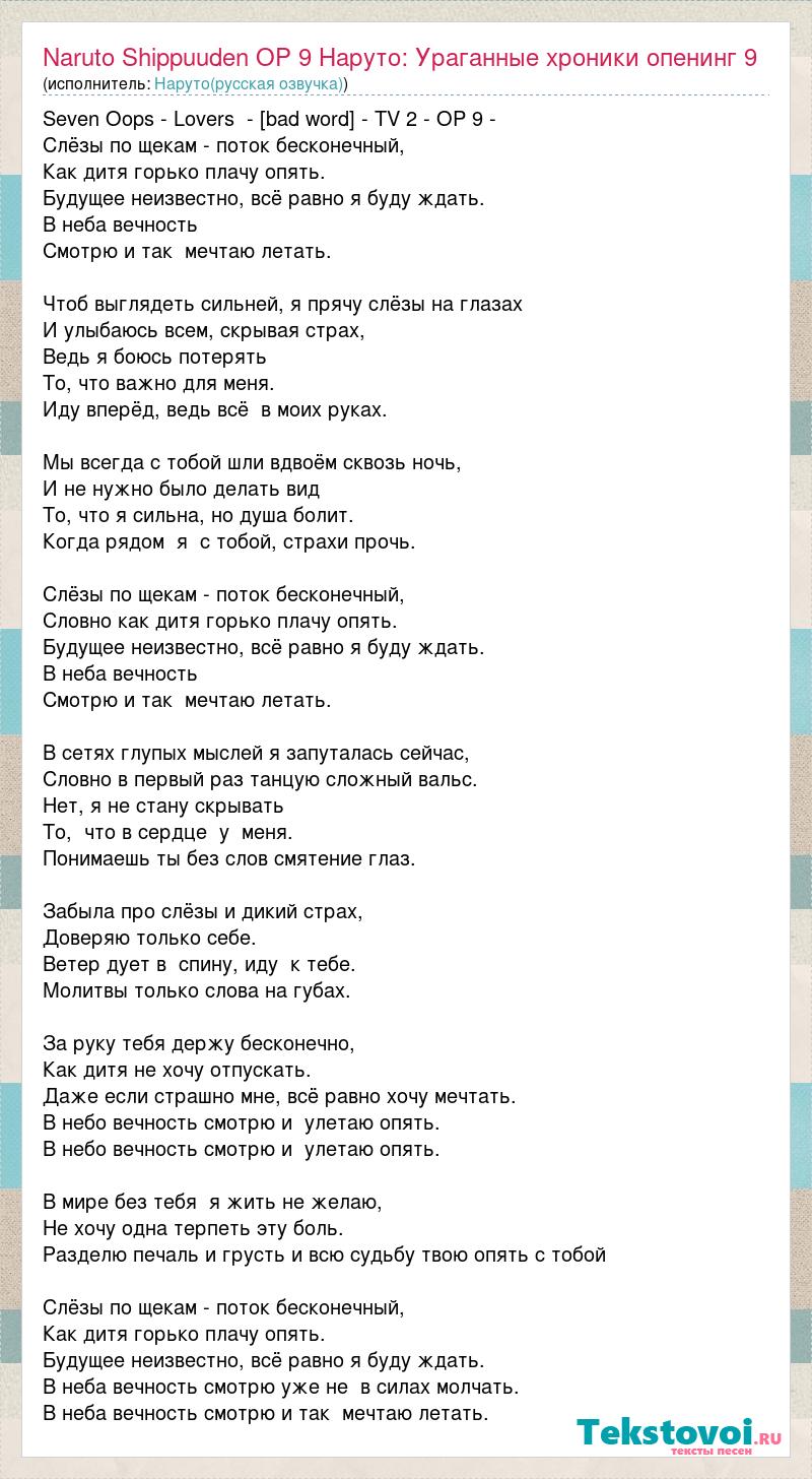 Seven Oops - Lovers - [bad word] - TV 2 - OP 9 - Слёзы по щекам - поток бесконечный, Как дитя горько плачу опять. Будущее неизвестно, всё равно я буду ждать. В неба вечность Смотрю и так мечтаю летать. Чтоб выглядеть сильней, я прячу слёзы на глазах И улыбаюсь всем, скрывая страх, Ведь я боюсь потерять То, что важно для меня. Иду вперёд, ведь всё в моих руках. Мы всегда с тобой шли вдвоём сквозь ночь, И не нужно было делать вид То, что я сильна, но душа болит. Когда рядом я с тобой, страхи прочь. Слёзы по щекам - поток бесконечный, Словно как дитя горько плачу опять. Будущее неизвестно, всё равно я буду ждать. В неба вечность Смотрю и так мечтаю летать. В сетях глупых мыслей я запуталась сейчас, Словно в первый раз танцую сложный вальс. Нет, я не стану скрывать То, что в сердце у меня. Понимаешь ты без слов смятение глаз. Забыла про слёзы и дикий страх, Доверяю только себе. Ветер дует в спину, иду к тебе. Молитвы только слова на губах. За руку тебя держу бесконечно, Как дитя не хочу отпускать. Даже если страшно мне, всё равно хочу мечтать. В небо вечность смотрю и улетаю опять. В небо вечность смотрю и улетаю опять. В мире без тебя я жить не желаю, Не хочу одна терпеть эту боль. Разделю печаль и грусть и всю судьбу твою опять с тобой Слёзы по щекам - поток бесконечный, Как дитя горько плачу опять. Будущее неизвестно, всё равно я буду ждать. В неба вечность смотрю уже не в силах молчать. В неба вечность смотрю и так мечтаю летать.