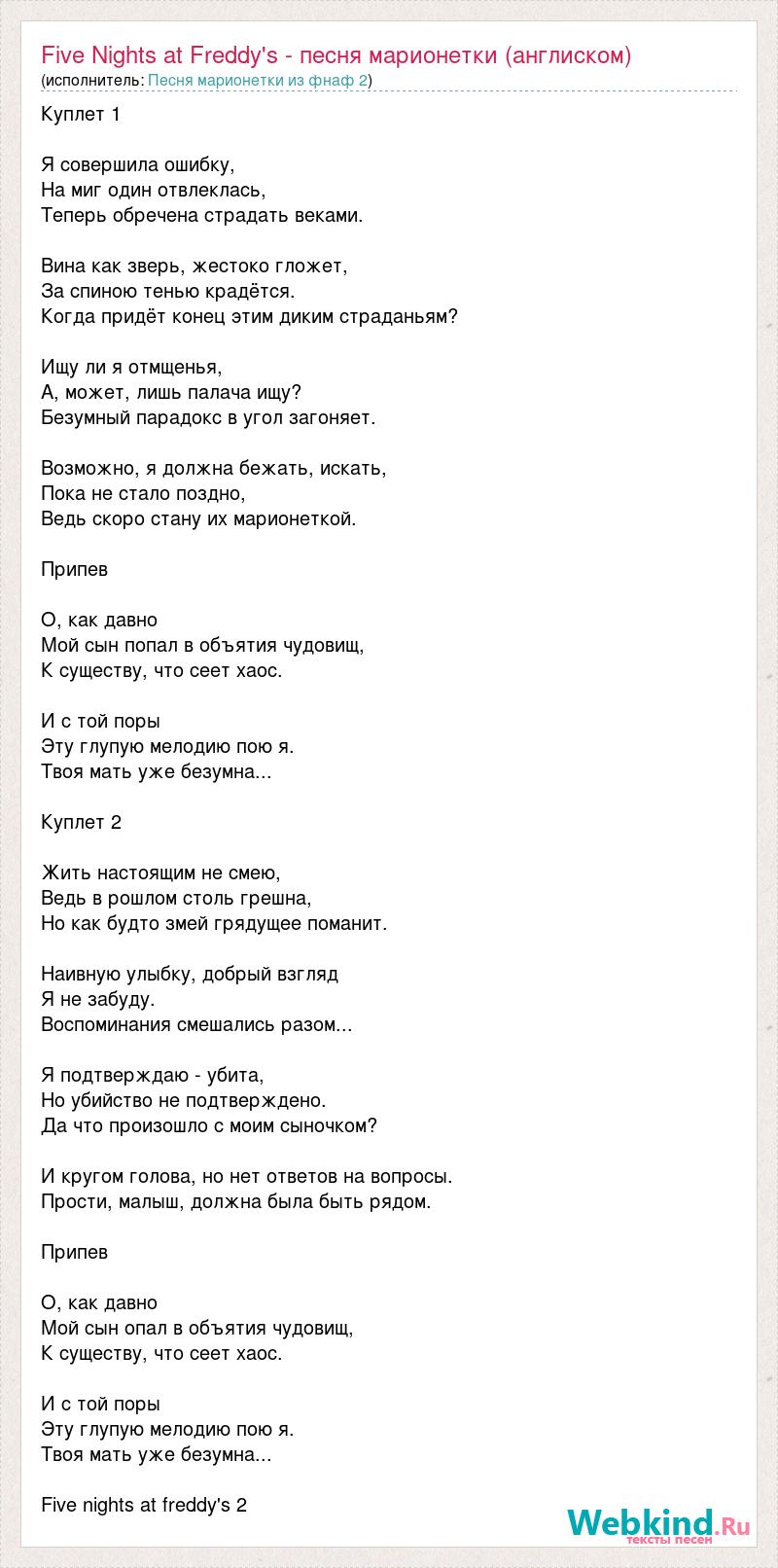 Куплет 1 Я совершила ошибку, На миг один отвлеклась, Теперь обречена страдать веками. Вина как зверь, жестоко гложет, За спиною тенью крадётся. Когда придёт конец этим диким страданьям? Ищу ли я отмщенья, А, может, лишь палача ищу? Безумный парадокс в угол загоняет. Возможно, я должна бежать, искать, Пока не стало поздно, Ведь скоро стану их марионеткой. Припев О, как давно Мой сын попал в объятия чудовищ, К существу, что сеет хаос. И с той поры Эту глупую мелодию пою я. Твоя мать уже безумна... Куплет 2 Жить настоящим не смею, Ведь в рошлом столь грешна, Но как будто змей грядущее поманит. Наивную улыбку, добрый взгляд Я не забуду. Воспоминания смешались разом... Я подтверждаю - убита, Но убийство не подтверждено. Да что произошло с моим сыночком? И кругом голова, но нет ответов на вопросы. Прости, малыш, должна была быть рядом. Припев О, как давно Мой сын опал в объятия чудовищ, К существу, что сеет хаос. И с той поры Эту глупую мелодию пою я. Твоя мать уже безумна... Five nights at freddy's 2