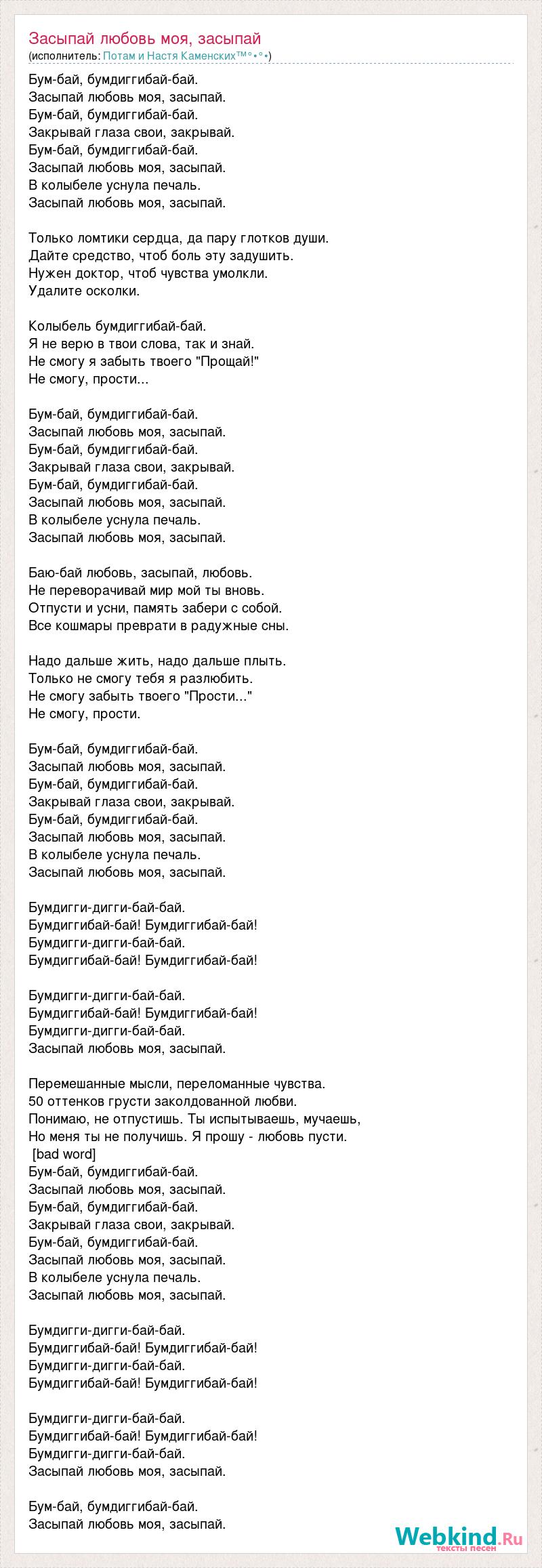 Бум-бай, бумдиггибай-бай. Засыпай любовь моя, засыпай. Бум-бай, бумдиггибай-бай. Закрывай глаза свои, закрывай. Бум-бай, бумдиггибай-бай. Засыпай любовь моя, засыпай. В колыбеле уснула печаль. Засыпай любовь моя, засыпай. Только ломтики сердца, да пару глотков души. Дайте средство, чтоб боль эту задушить. Нужен доктор, чтоб чувства умолкли. Удалите осколки. Колыбель бумдиггибай-бай. Я не верю в твои слова, так и знай. Не смогу я забыть твоего "Прощай!" Не смогу, прости... Бум-бай, бумдиггибай-бай. Засыпай любовь моя, засыпай. Бум-бай, бумдиггибай-бай. Закрывай глаза свои, закрывай. Бум-бай, бумдиггибай-бай. Засыпай любовь моя, засыпай. В колыбеле уснула печаль. Засыпай любовь моя, засыпай. Баю-бай любовь, засыпай, любовь. Не переворачивай мир мой ты вновь. Отпусти и усни, память забери с собой. Все кошмары преврати в радужные сны. Надо дальше жить, надо дальше плыть. Только не смогу тебя я разлюбить. Не смогу забыть твоего "Прости..." Не смогу, прости. Бум-бай, бумдиггибай-бай. Засыпай любовь моя, засыпай. Бум-бай, бумдиггибай-бай. Закрывай глаза свои, закрывай. Бум-бай, бумдиггибай-бай. Засыпай любовь моя, засыпай. В колыбеле уснула печаль. Засыпай любовь моя, засыпай. Бумдигги-дигги-бай-бай. Бумдиггибай-бай! Бумдиггибай-бай! Бумдигги-дигги-бай-бай. Бумдиггибай-бай! Бумдиггибай-бай! Бумдигги-дигги-бай-бай. Бумдиггибай-бай! Бумдиггибай-бай! Бумдигги-дигги-бай-бай. Засыпай любовь моя, засыпай. Перемешанные мысли, переломанные чувства. 50 оттенков грусти заколдованной любви. Понимаю, не отпустишь. Ты испытываешь, мучаешь, Но меня ты не получишь. Я прошу - любовь пусти. [bad word] Бум-бай, бумдиггибай-бай. Засыпай любовь моя, засыпай. Бум-бай, бумдиггибай-бай. Закрывай глаза свои, закрывай. Бум-бай, бумдиггибай-бай. Засыпай любовь моя, засыпай. В колыбеле уснула печаль. Засыпай любовь моя, засыпай. Бумдигги-дигги-бай-бай. Бумдиггибай-бай! Бумдиггибай-бай! Бумдигги-дигги-бай-бай. Бумдиггибай-бай! Бумдиггибай-бай! Бумдигги-дигги-бай-бай. Бумдиггибай-бай! Бумдиггибай-бай! Бумдигги-дигги-бай-бай. Засыпай любовь моя, засыпай. Бум-бай, бумдиггибай-бай. Засыпай любовь моя, засыпай.