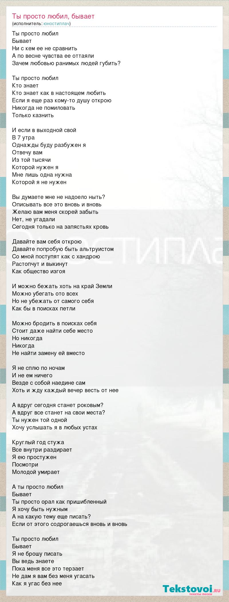 Ты просто любил Бывает Ни с кем ее не сравнить А по весне чувства ее оттаяли Зачем любовью ранимых людей губить? Ты просто любил Кто знает Кто знает как в настоящем любить Если я еще раз кому-то душу открою Никогда не помиловать Только казнить И если в выходной свой В 7 утра Однажды буду разбужен я Отвечу вам Из той тысячи Которой нужен я Мне лишь одна нужна Которой я не нужен Вы думаете мне не надоело ныть? Описывать все это вновь и вновь Желаю вам меня скорей забыть Нет, не угадали Сегодня только на запястьях кровь Давайте вам себя открою Давайте попробую быть альтруистом Со мной поступят как с хандрою Растопчут и выкинут Как общество изгоя И можно бежать хоть на край Земли Можно убегать ото всех Но не убежать от самого себя Как бы в поисках петли Можно бродить в поисках себя Стоит даже найти себе место Но никогда Никогда Не найти замену ей вместо Я не сплю по ночам И не ем ничего Везде с собой наедине сам Хоть и жду каждый вечер весть от нее А вдруг сегодня станет роковым? А вдруг все станет на свои места? Ты нужен той одной Хочу услышать я в любых устах Круглый год стужа Все внутри раздирает Я ею простужен Посмотри Молодой умирает А ты просто любил Бывает Ты просто орал как пришибленный Я хочу быть нужным А на какую тему еще писать? Если от этого содрогаешься вновь и вновь Ты просто любил Бывает Я не брошу писать Вы ведь знаете Пока меня все это терзает Не дам я вам без меня угасать Как я угас без нее