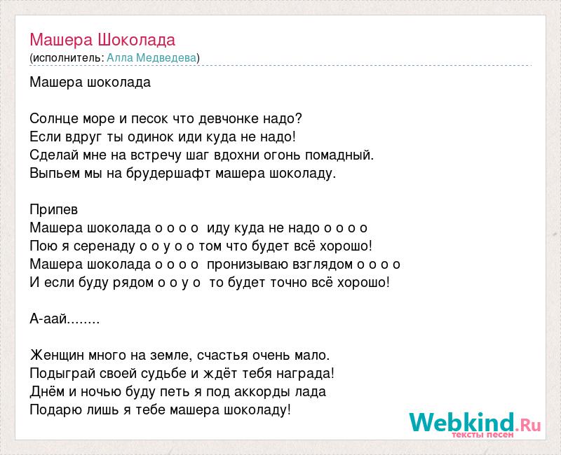 Машера шоколада Солнце море и песок что девчонке надо? Если вдруг ты одинок иди куда не надо! Сделай мне на встречу шаг вдохни огонь помадный. Выпьем мы на брудершафт машера шоколаду. Припев Машера шоколада о о о о иду куда не надо о о о о Пою я серенаду о о у о о том что будет всё хорошо! Машера шоколада о о о о пронизываю взглядом о о о о И если буду рядом о о у о то будет точно всё хорошо! А-аай........ Женщин много на земле, счастья очень мало. Подыграй своей судьбе и ждёт тебя награда! Днём и ночью буду петь я под аккорды лада Подарю лишь я тебе машера шоколаду!
