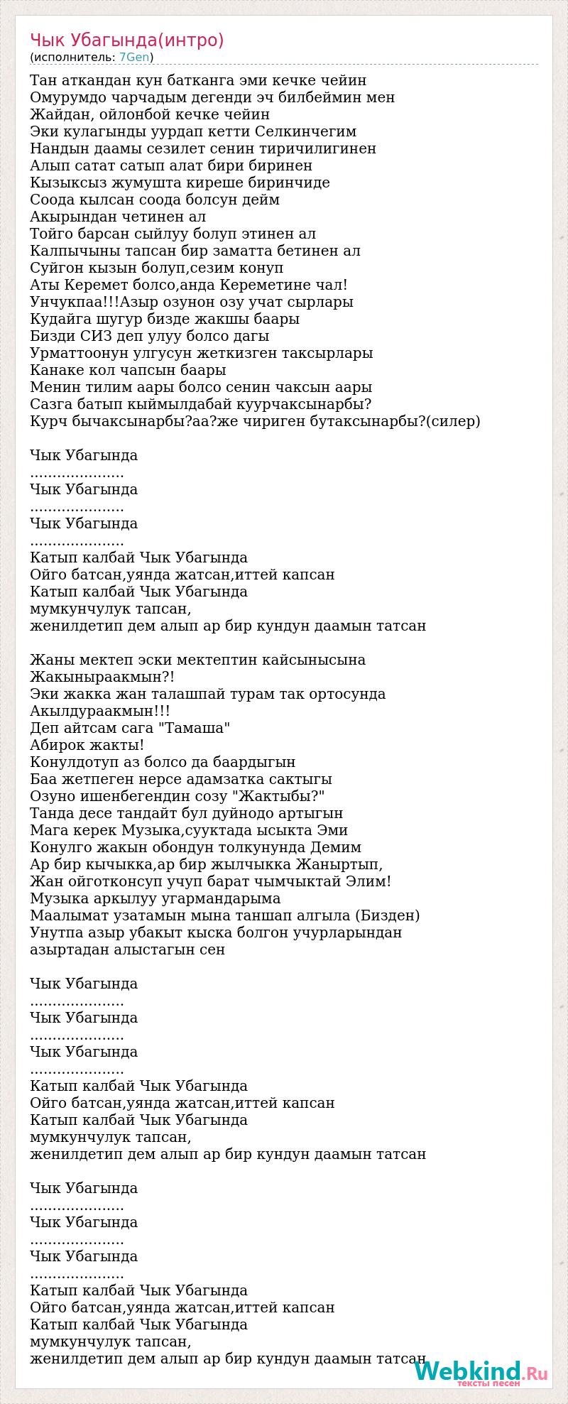 Тан аткандан кун батканга эми кечке чейин Омурумдо чарчадым дегенди эч билбеймин мен Жайдан, ойлонбой кечке чейин Эки кулагынды уурдап кетти Селкинчегим Нандын даамы сезилет сенин тиричилигинен Алып сатат сатып алат бири биринен Кызыксыз жумушта киреше биринчиде Соода кылсан соода болсун дейм Акырындан четинен ал Тойго барсан сыйлуу болуп этинен ал Калпычыны тапсан бир заматта бетинен ал Суйгон кызын болуп,сезим конуп Аты Керемет болсо,анда Кереметине чал! Унчукпаа!!!Азыр озунон озу учат сырлары Кудайга шугур бизде жакшы баары Бизди СИЗ деп улуу болсо дагы Урматтоонун улгусун жеткизген таксырлары Канаке кол чапсын баары Менин тилим аары болсо сенин чаксын аары Сазга батып кыймылдабай куурчаксынарбы? Курч бычаксынарбы?аа?же чириген бутаксынарбы?(силер) Чык Убагында ..................... Чык Убагында ..................... Чык Убагында ..................... Катып калбай Чык Убагында Ойго батсан,уянда жатсан,иттей капсан Катып калбай Чык Убагында мумкунчулук тапсан, женилдетип дем алып ар бир кундун даамын татсан Жаны мектеп эски мектептин кайсынысына Жакыныраакмын?! Эки жакка жан талашпай турам так ортосунда Акылдураакмын!!! Деп айтсам сага "Тамаша" Абирок жакты! Конулдотуп аз болсо да баардыгын Баа жетпеген нерсе адамзатка сактыгы Озуно ишенбегендин созу "Жактыбы?" Танда десе тандайт бул дуйнодо артыгын Мага керек Музыка,сууктада ысыкта Эми Конулго жакын обондун толкунунда Демим Ар бир кычыкка,ар бир жылчыкка Жаныртып, Жан ойготконсуп учуп барат чымчыктай Элим! Музыка аркылуу угармандарыма Маалымат узатамын мына таншап алгыла (Бизден) Унутпа азыр убакыт кыска болгон учурларындан азыртадан алыстагын сен Чык Убагында ..................... Чык Убагында ..................... Чык Убагында ..................... Катып калбай Чык Убагында Ойго батсан,уянда жатсан,иттей капсан Катып калбай Чык Убагында мумкунчулук тапсан, женилдетип дем алып ар бир кундун даамын татсан Чык Убагында ..................... Чык Убагында ..................... Чык Убагында ..................... Катып калбай Чык Убагында Ойго батсан,уянда жатсан,иттей капсан Катып калбай Чык Убагында мумкунчулук тапсан, женилдетип дем алып ар бир кундун даамын татсан