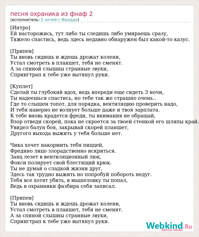 [Интро] Ей насторожись, тут либо ты следишь либо умираешь сразу, Тяжело спастись, ведь здесь недавно обнаружен был какой-то казус. [Припев] Ты вновь сидишь и ждешь дрожат колени, Устал смотреть в планшет, тебя не сменят. А за спиной слышны странные звуки, Спрингтрап к тебе уже вытянул руки. [Куплет] Сделай ты глубокий вдох, ведь впереди еще сидеть 3 ночи, Ты надеешься спастись, но тебе так же страшно очень.. Где то слышен топот, для порядка, вентиляцию проверить надо, И тебя наверно не волнует больше даже и твоя зарплата. К тебе вновь крадется фреди, ты внимания не обращай, Взор отведи скорей, пока не скроется за твоей стенкой его шляпы край. Увидел балун боя, закрывай скорей планшет, Другого выхода выжить у тебя больше нет. Чика хочет накормить тебя пиццей, Фредино лицо злорадственно искриться. Заяц лезет в вентиляционный люк, Фокси полирует свой блестящий крюк. Ты не думай о сладкой жизни друг, Здесь так трудно выжить но попробуй побороть недуг. Тебя все хотят убить, в мышеловку ты попал, Ведь в охранники фазбира себя записал. [Припев] Ты вновь сидишь и ждешь дрожат колени, Устал смотреть в планшет, тебя не сменят. А за спиной слышны странные звуки, Спрингтрап к тебе уже вытянул руки.