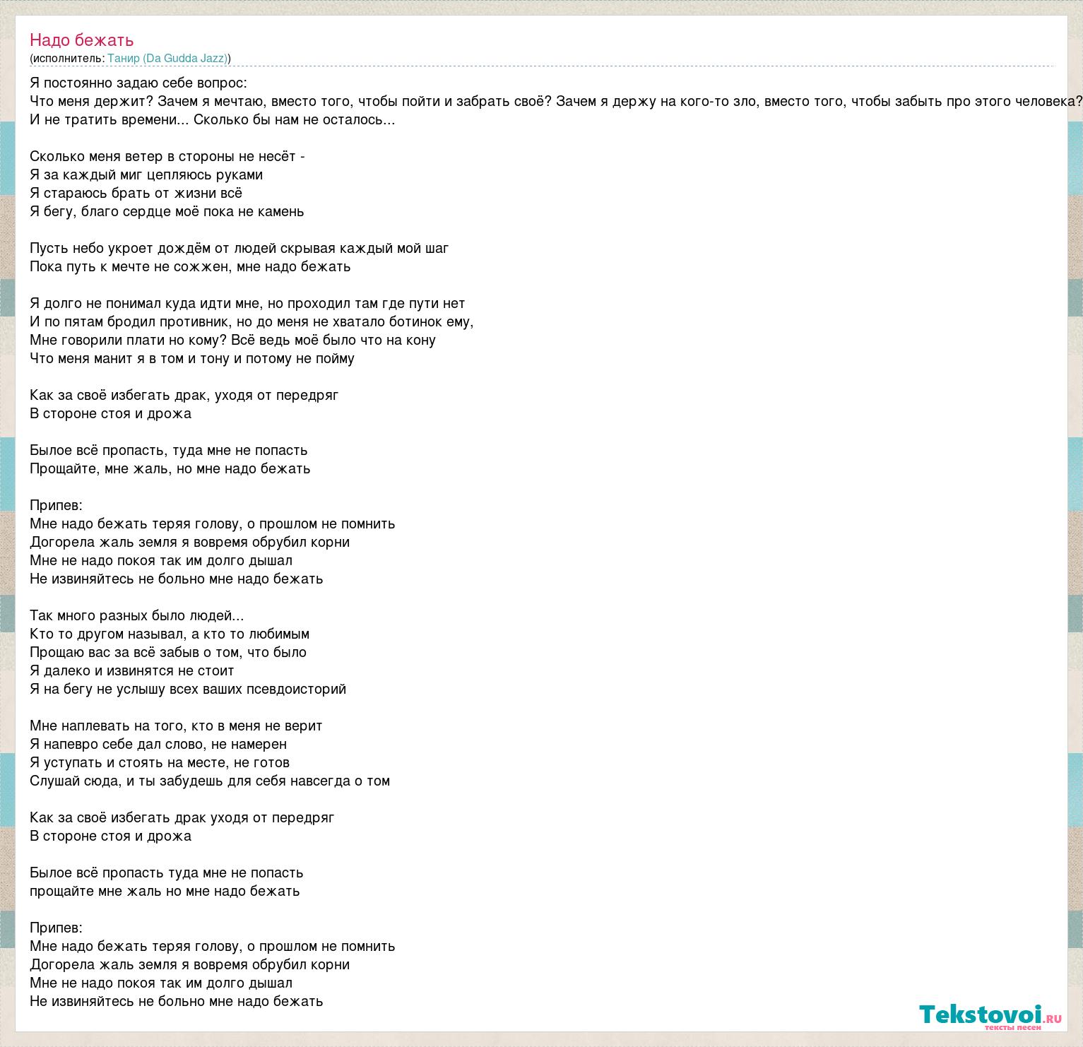 Я постоянно задаю себе вопрос: Что меня держит? Зачем я мечтаю, вместо того, чтобы пойти и забрать своё? Зачем я держу на кого-то зло, вместо того, чтобы забыть про этого человека? И не тратить времени... Сколько бы нам не осталось... Сколько меня ветер в стороны не несёт - Я за каждый миг цепляюсь руками Я стараюсь брать от жизни всё Я бегу, благо сердце моё пока не камень Пусть небо укроет дождём от людей скрывая каждый мой шаг Пока путь к мечте не сожжен, мне надо бежать Я долго не понимал куда идти мне, но проходил там где пути нет И по пятам бродил противник, но до меня не хватало ботинок ему, Мне говорили плати но кому? Всё ведь моё было что на кону Что меня манит я в том и тону и потому не пойму Как за своё избегать драк, уходя от передряг В стороне стоя и дрожа Былое всё пропасть, туда мне не попасть Прощайте, мне жаль, но мне надо бежать Припев: Мне надо бежать теряя голову, о прошлом не помнить Догорела жаль земля я вовремя обрубил корни Мне не надо покоя так им долго дышал Не извиняйтесь не больно мне надо бежать Так много разных было людей... Кто то другом называл, а кто то любимым Прощаю вас за всё забыв о том, что было Я далеко и извинятся не стоит Я на бегу не услышу всех ваших псевдоисторий Мне наплевать на того, кто в меня не верит Я напевро себе дал слово, не намерен Я уступать и стоять на месте, не готов Слушай сюда, и ты забудешь для себя навсегда о том Как за своё избегать драк уходя от передряг В стороне стоя и дрожа Былое всё пропасть туда мне не попасть прощайте мне жаль но мне надо бежать Припев: Мне надо бежать теряя голову, о прошлом не помнить Догорела жаль земля я вовремя обрубил корни Мне не надо покоя так им долго дышал Не извиняйтесь не больно мне надо бежать