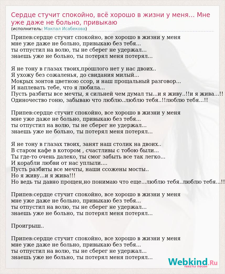 Припев:сердце стучит спокойно, все хорошо в жизни у меня мне уже даже не больно, привыкаю без тебя... ты отпустил на волю, ты не сберег не удержал... знаешь уже не больно, ты потерял меня потерял... Я не тону в глазах твоих,прошлого нет у нас двоих.. Я ухожу без сожаленья, до свидания милый... Мокрых зонтов цветною ссор, и наш прощальный разговор... И наплевать тебе, что я любила... Пусть разбиты все мечты, я сильней чем думал ты...и я живу..!!и я жива...!! Одиночество гоню, забываю что люблю..люблю тебя..!!люблю тебя...!! Припев:сердце стучит спокойно, все хорошо в жизни у меня мне уже даже не больно, привыкаю без тебя... ты отпустил на волю, ты не сберег не удержал... знаешь уже не больно, ты потерял меня потерял... Я не тону в глазах твоих, занят наш столик на двоих.. В старом кафе в котором , счастливы с тобою были... Ты где-то очень далеко, ты смог забыть все так легко... И корабли любви от нас уплыли.... Пусть разбиты все мечты, наши ссожены мосты.. Но я живу...и я жива!!! Но ведь ты давно прощен,но понимаю что еще...люблю тебя..люблю тебя...!! Припев:сердце стучит спокойно, все хорошо в жизни у меня мне уже даже не больно, привыкаю без тебя... ты отпустил на волю, ты не сберег не удержал... знаешь уже не больно, ты потерял меня потерял... Проигрыш.. Припев:сердце стучит спокойно, все хорошо в жизни у меня мне уже даже не больно, привыкаю без тебя... ты отпустил на волю, ты не сберег не удержал... знаешь уже не больно, ты потерял меня потерял...