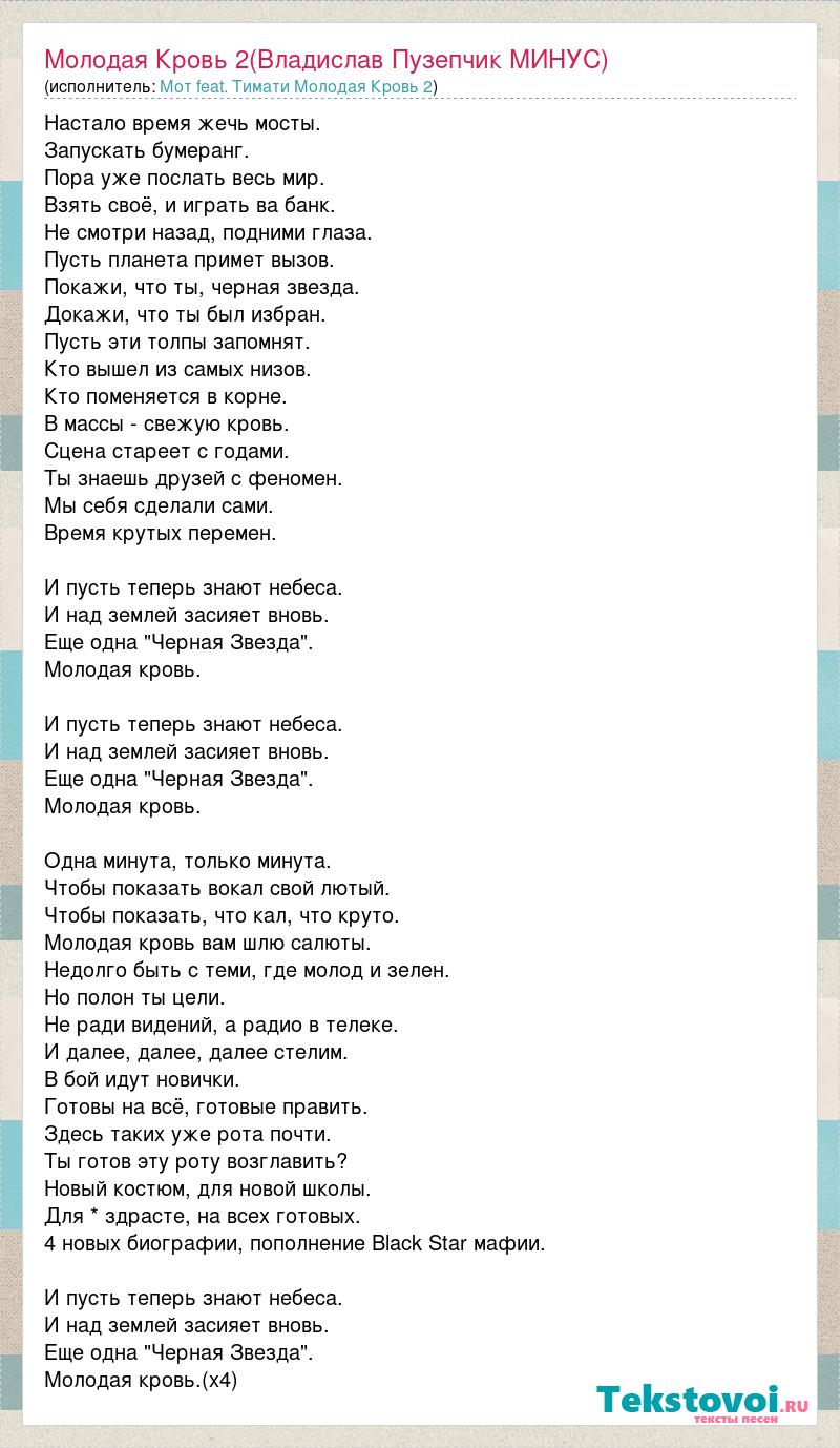 Настало время жечь мосты. Запускать бумеранг. Пора уже послать весь мир. Взять своё, и играть ва банк. Не смотри назад, подними глаза. Пусть планета примет вызов. Покажи, что ты, черная звезда. Докажи, что ты был избран. Пусть эти толпы запомнят. Кто вышел из самых низов. Кто поменяется в корне. В массы - свежую кровь. Сцена стареет с годами. Ты знаешь друзей с феномен. Мы себя сделали сами. Время крутых перемен. И пусть теперь знают небеса. И над землей засияет вновь. Еще одна "Черная Звезда". Молодая кровь. И пусть теперь знают небеса. И над землей засияет вновь. Еще одна "Черная Звезда". Молодая кровь. Одна минута, только минута. Чтобы показать вокал свой лютый. Чтобы показать, что кал, что круто. Молодая кровь вам шлю салюты. Недолго быть с теми, где молод и зелен. Но полон ты цели. Не ради видений, а радио в телеке. И далее, далее, далее стелим. В бой идут новички. Готовы на всё, готовые править. Здесь таких уже рота почти. Ты готов эту роту возглавить? Новый костюм, для новой школы. Для * здрасте, на всех готовых. 4 новых биографии, пополнение Black Star мафии. И пусть теперь знают небеса. И над землей засияет вновь. Еще одна "Черная Звезда". Молодая кровь.(х4)
