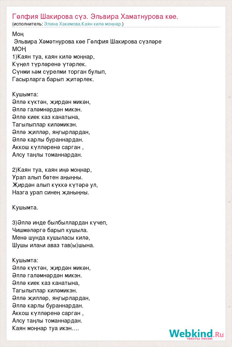 Моң Эльвира Хәмәтнурова көе Гөлфия Шакирова сүзләре МОҢ 1)Каян туа, каян килә моңнар, Күңел түрләренә үтәрлек. Сүнми һәм сүрелми торган булып, Гасырларга барып җитәрлек. Кушымта: Әллә күктән, җирдән микән, Әллә галәмнәрдән микэн. Әллә киек каз канатына, Тагылыплар киләмикэн. Әллә җилләр, яңгырлардан, Әллә карлы бураннардан. Аккош күлләренә сарган , Алсу таңлы томаннардан. 2)Каян туа, каян иңә моңнар, Урап алып бөтен аңыңны. Җирдән алып күккә күтәрә ул, Назга урап синең җаныңны. Кушымта. 3)Әллә инде былбыллардан күчеп, Чишмәләргә барып кушыла. Менә шунда кушыласы килә, Шушы илаһи аваз тав(ы)шына. Кушымта: Әллә күктән, җирдән микән, Әллә галәмнәрдән микэн. Әллә киек каз канатына, Тагылыплар киләмикэн. Әллә җилләр, яңгырлардан, Әллә карлы бураннардан. Аккош күлләренә сарган , Алсу таңлы томаннардан. Каян моңнар туа икэн….