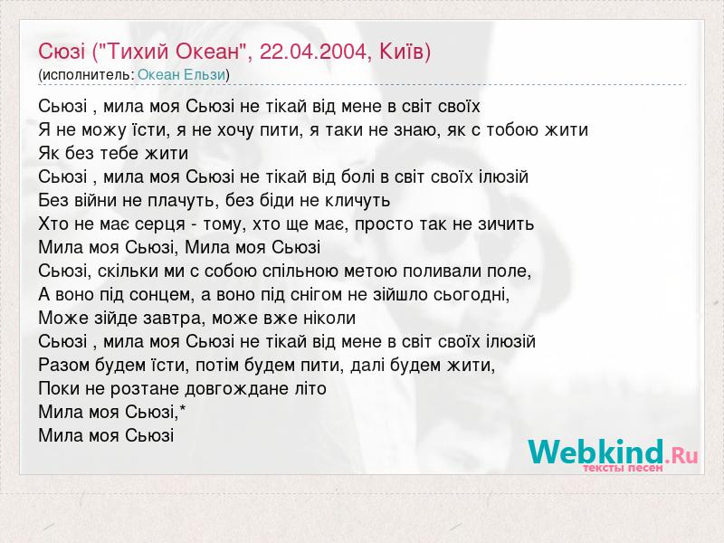Сьюзі , мила моя Сьюзі не тікай від мене в світ своїх Я не можу їсти, я не хочу пити, я таки не знаю, як с тобою жити Як без тебе жити Сьюзі , мила моя Сьюзі не тікай від болі в світ своїх ілюзій Без війни не плачуть, без біди не кличуть Хто не має серця - тому, хто ще має, просто так не зичить Мила моя Сьюзі, Мила моя Сьюзі Сьюзі, скільки ми с собою спільною метою поливали поле, А воно під сонцем, а воно під снігом не зійшло сьогодні, Може зійде завтра, може вже ніколи Сьюзі , мила моя Сьюзі не тікай від мене в світ своїх ілюзій Разом будем їсти, потім будем пити, далі будем жити, Поки не розтане довгождане літо Мила моя Сьюзі,* Мила моя Сьюзі