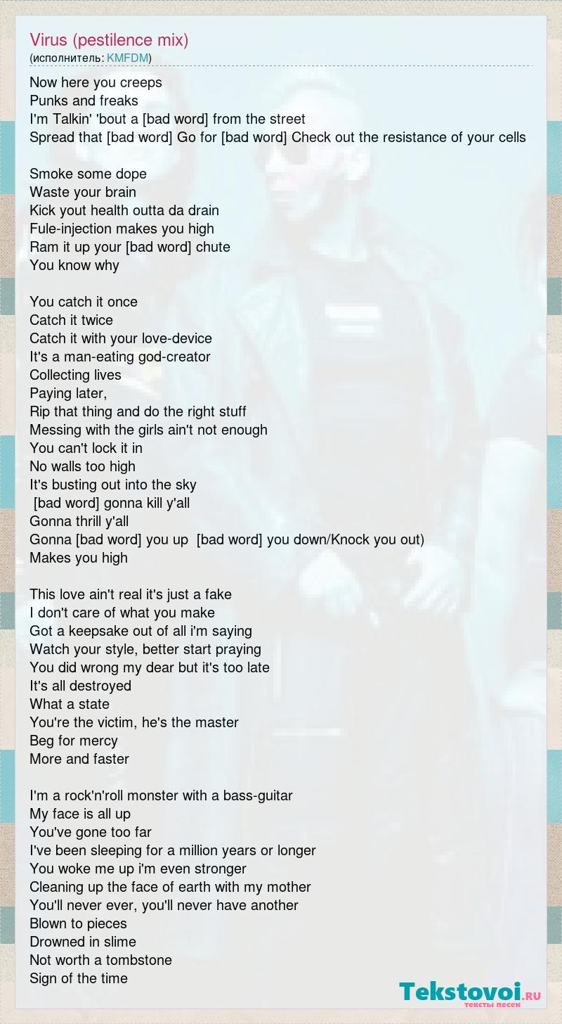 Now here you creeps Punks and freaks I'm Talkin' 'bout a virus from the street Spread that virus Go for hell Check out the resistance of your cells Smoke some dope Waste your brain Kick yout health outta da drain Fule-injection makes you high Ram it up your [bad word] chute You know why You catch it once Catch it twice Catch it with your love-device It's a man-eating god-creator Collecting lives Paying later, Rip that thing and do the right stuff Messing with the girls ain't not enough You can't lock it in No walls too high It's busting out into the sky Virus gonna kill y'all Gonna thrill y'all Gonna [bad word] you up [bad word] you down/Knock you out) Makes you high This love ain't real it's just a fake I don't care of what you make Got a keepsake out of all i'm saying Watch your style, better start praying You did wrong my dear but it's too late It's all destroyed What a state You're the victim, he's the master Beg for mercy More and faster I'm a rock'n'roll monster with a bass-guitar My face is all up You've gone too far I've been sleeping for a million years or longer You woke me up i'm even stronger Cleaning up the face of earth with my mother You'll never ever, you'll never have another Blown to pieces Drowned in slime Not worth a tombstone Sign of the time