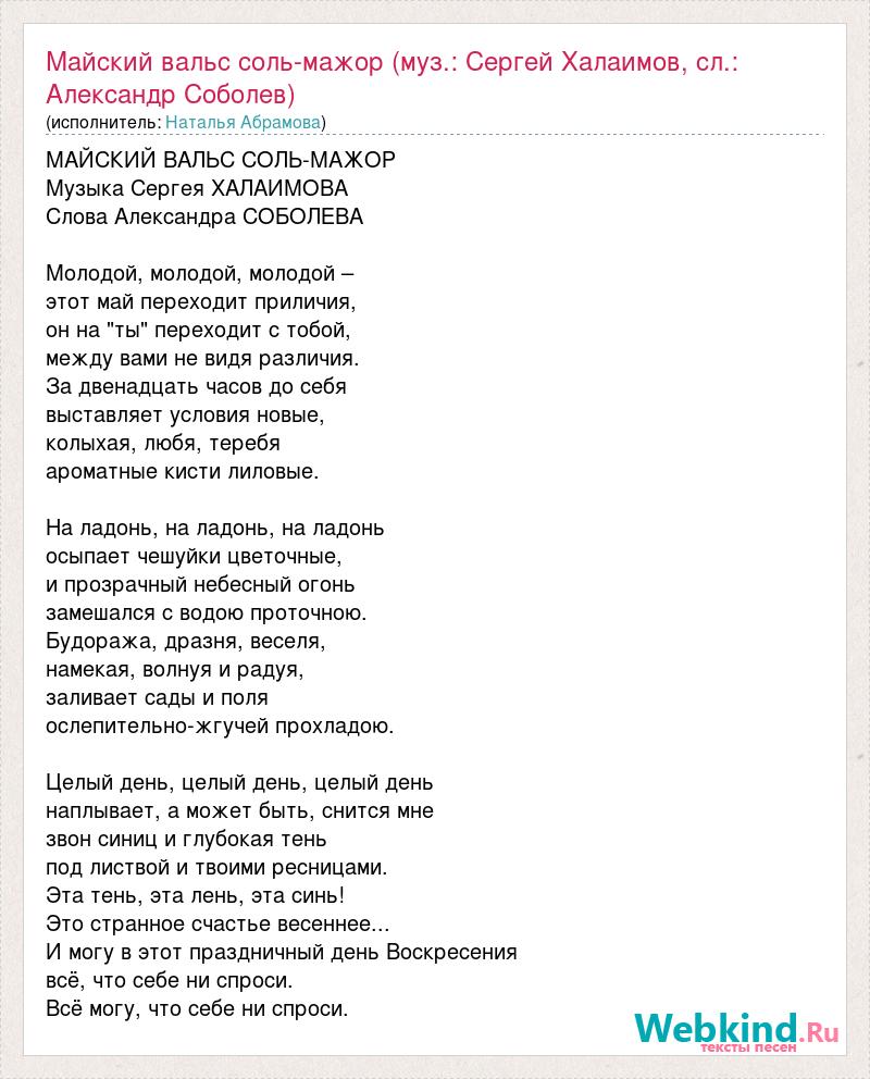 МАЙСКИЙ ВАЛЬС СОЛЬ-МАЖОР Музыка Сергея ХАЛАИМОВА Слова Александра СОБОЛЕВА Молодой, молодой, молодой – этот май переходит приличия, он на "ты" переходит с тобой, между вами не видя различия. За двенадцать часов до себя выставляет условия новые, колыхая, любя, теребя ароматные кисти лиловые. На ладонь, на ладонь, на ладонь осыпает чешуйки цветочные, и прозрачный небесный огонь замешался с водою проточною. Будоража, дразня, веселя, намекая, волнуя и радуя, заливает сады и поля ослепительно-жгучей прохладою. Целый день, целый день, целый день наплывает, а может быть, снится мне звон синиц и глубокая тень под листвой и твоими ресницами. Эта тень, эта лень, эта синь! Это странное счастье весеннее... И могу в этот праздничный день Воскресения всё, что себе ни спроси. Всё могу, что себе ни спроси.