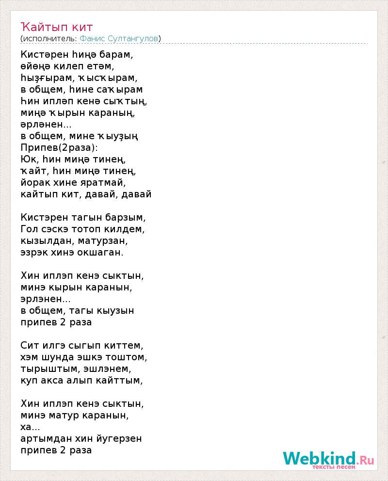 Кистәрен һиңә барам, өйөңә килеп етәм, һыҙғырам, ҡысҡырам, в общем, һине саҡырам Һин ипләп кенә сыҡтың, миңә ҡырын караның, әрләнен... в общем, мине ҡыуҙың Припев(2раза): Юк, һин миңә тинең, ҡайт, һин миңә тинең, йорак хине яратмай, кайтып кит, давай, давай Кистэрен тагын барзым, Гол сэскэ тотоп килдем, кызылдан, матурзан, эзрэк хинэ окшаган. Хин иплэп кенэ сыктын, минэ кырын каранын, эрлэнен... в общем, тагы кыузын припев 2 раза Сит илгэ сыгып киттем, хэм шунда эшкэ тоштом, тырыштым, эшлэнем, куп акса алып кайттым, Хин иплэп кенэ сыктын, минэ матур каранын, ха... артымдан хин йугерзен припев 2 раза