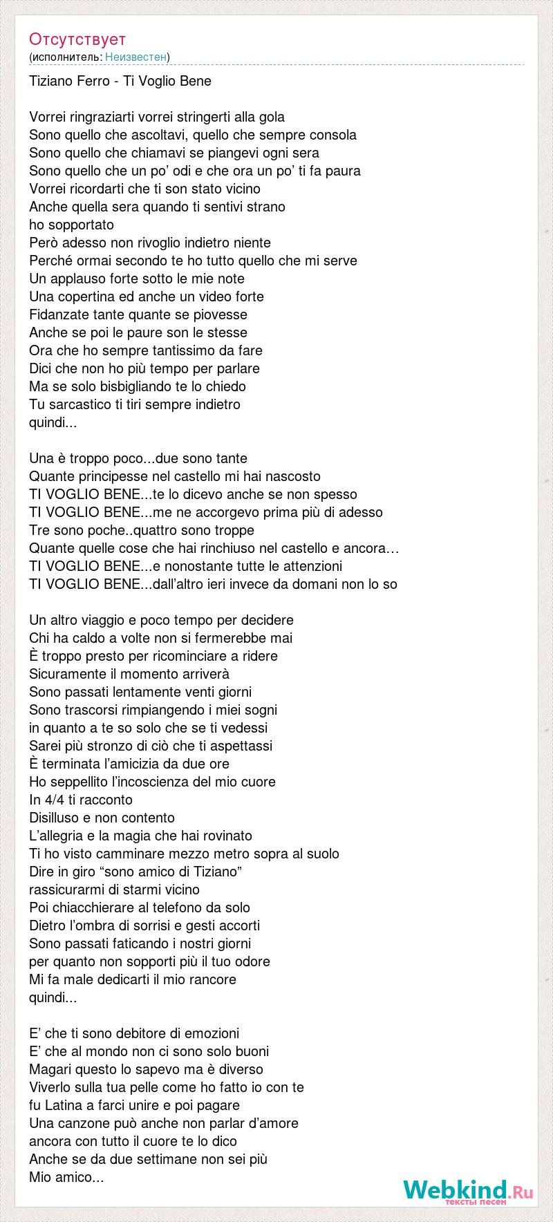 Tiziano Ferro - Ti Voglio Bene Vorrei ringraziarti vorrei stringerti alla gola Sono quello che ascoltavi, quello che sempre consola Sono quello che chiamavi se piangevi ogni sera Sono quello che un po’ odi e che ora un po’ ti fa paura Vorrei ricordarti che ti son stato vicino Anche quella sera quando ti sentivi strano ho sopportato Però adesso non rivoglio indietro niente Perché ormai secondo te ho tutto quello che mi serve Un applauso forte sotto le mie note Una copertina ed anche un video forte Fidanzate tante quante se piovesse Anche se poi le paure son le stesse Ora che ho sempre tantissimo da fare Dici che non ho più tempo per parlare Ma se solo bisbigliando te lo chiedo Tu sarcastico ti tiri sempre indietro quindi... Una è troppo poco...due sono tante Quante principesse nel castello mi hai nascosto TI VOGLIO BENE...te lo dicevo anche se non spesso TI VOGLIO BENE...me ne accorgevo prima più di adesso Tre sono poche..quattro sono troppe Quante quelle cose che hai rinchiuso nel castello e ancora… TI VOGLIO BENE...e nonostante tutte le attenzioni TI VOGLIO BENE...dall’altro ieri invece da domani non lo so Un altro viaggio e poco tempo per decidere Chi ha caldo a volte non si fermerebbe mai È troppo presto per ricominciare a ridere Sicuramente il momento arriverà Sono passati lentamente venti giorni Sono trascorsi rimpiangendo i miei sogni in quanto a te so solo che se ti vedessi Sarei più stronzo di ciò che ti aspettassi È terminata l’amicizia da due ore Ho seppellito l’incoscienza del mio cuore In 4/4 ti racconto Disilluso e non contento L’allegria e la magia che hai rovinato Ti ho visto camminare mezzo metro sopra al suolo Dire in giro “sono amico di Tiziano” rassicurarmi di starmi vicino Poi chiacchierare al telefono da solo Dietro l’ombra di sorrisi e gesti accorti Sono passati faticando i nostri giorni per quanto non sopporti più il tuo odore Mi fa male dedicarti il mio rancore quindi... E’ che ti sono debitore di emozioni E’ che al mondo non ci sono solo buoni Magari questo lo sapevo ma è diverso Viverlo sulla tua pelle come ho fatto io con te fu Latina a farci unire e poi pagare Una canzone può anche non parlar d’amore ancora con tutto il cuore te lo dico Anche se da due settimane non sei più Mio amico...