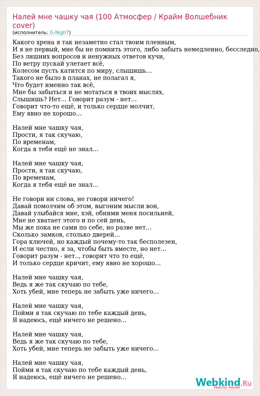Какого хрена я так незаметно стал твоим пленным, И я не первый, мне бы не помнить этого, либо забыть немедленно, бесследно, Без лишних вопросов и ненужных ответов кучи, По ветру пускай улетает всё, Колесом пусть катится по миру, слышишь… Такого не было в планах, не полагал я, Что будет именно так всё, Мне бы забыться и не мотаться в твоих мыслях, Слышишь? Нет… Говорит разум - нет… Говорит что-то ещё, и только сердце молчит, Ему явно не хорошо… Налей мне чашку чая, Прости, я так скучаю, По временам, Когда я тебя ещё не знал… Налей мне чашку чая, Прости, я так скучаю, По временам, Когда я тебя ещё не знал... Не говори ни слова, не говори ничего! Давай помолчим об этом, выгоним мысли вон, Давай улыбайся мне, хэй, обними меня посильней, Мне не хватает этого и по сей день, Мы же пока не сами по себе, но разве нет… Сколько замков, столько дверей… Гора ключей, но каждый почему-то так бесполезен, И если честно, я за, чтобы быть вместе, но нет… Говорит разум - нет.., говорит что то ещё, И только сердце кричит, ему явно не хорошо… Налей мне чашку чая, Ведь я же так скучаю по тебе, Хоть убей, мне теперь не забыть уже ничего… Налей мне чашку чая, Пойми я так скучаю по тебе каждый день, Я надеюсь, ещё ничего не решено… Налей мне чашку чая, Ведь я же так скучаю по тебе, Хоть убей, мне теперь не забыть уже ничего… Налей мне чашку чая, Пойми я так скучаю по тебе каждый день, Я надеюсь, ещё ничего не решено…