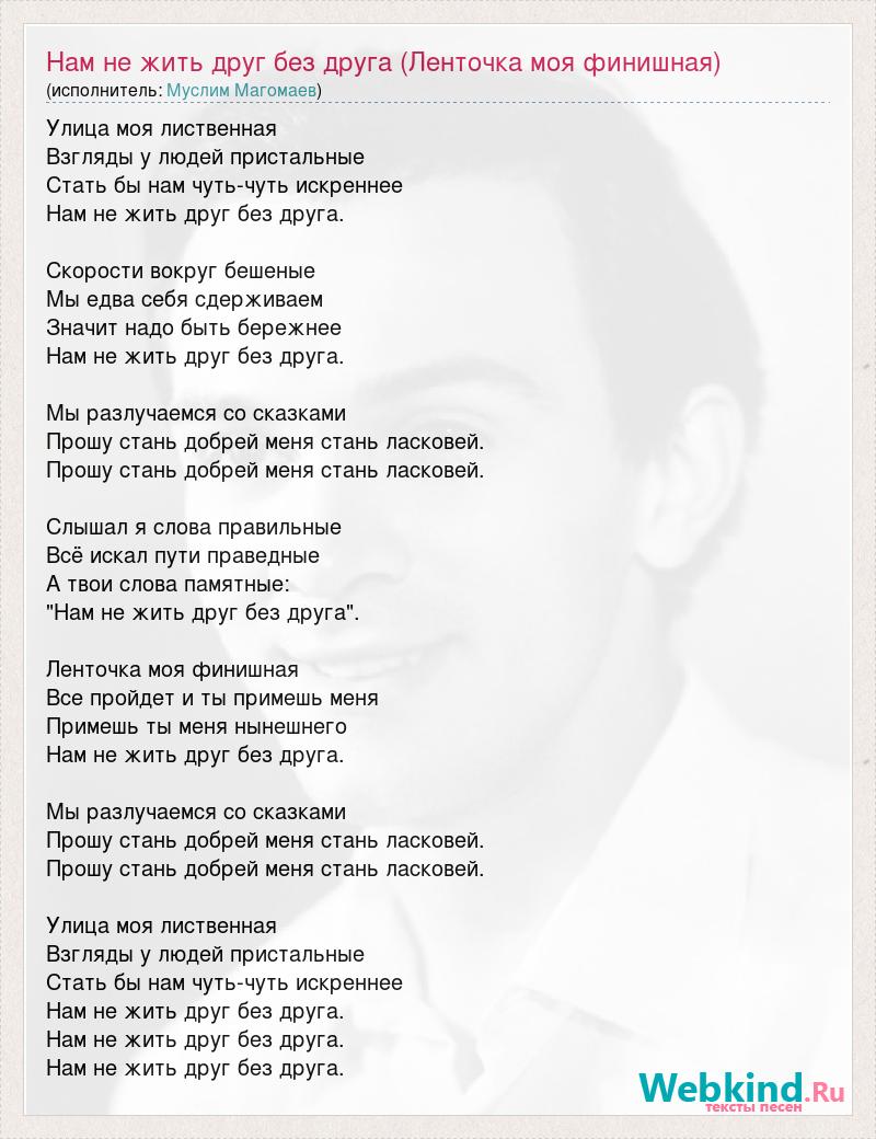 Улица моя лиственная Взгляды у людей пристальные Стать бы нам чуть-чуть искреннее Нам не жить друг без друга. Скорости вокруг бешеные Мы едва себя сдерживаем Значит надо быть бережнее Нам не жить друг без друга. Мы разлучаемся со сказками Прошу стань добрей меня стань ласковей. Прошу стань добрей меня стань ласковей. Слышал я слова правильные Всё искал пути праведные А твои слова памятные: "Нам не жить друг без друга". Ленточка моя финишная Все пройдет и ты примешь меня Примешь ты меня нынешнего Нам не жить друг без друга. Мы разлучаемся со сказками Прошу стань добрей меня стань ласковей. Прошу стань добрей меня стань ласковей. Улица моя лиственная Взгляды у людей пристальные Стать бы нам чуть-чуть искреннее Нам не жить друг без друга. Нам не жить друг без друга. Нам не жить друг без друга.