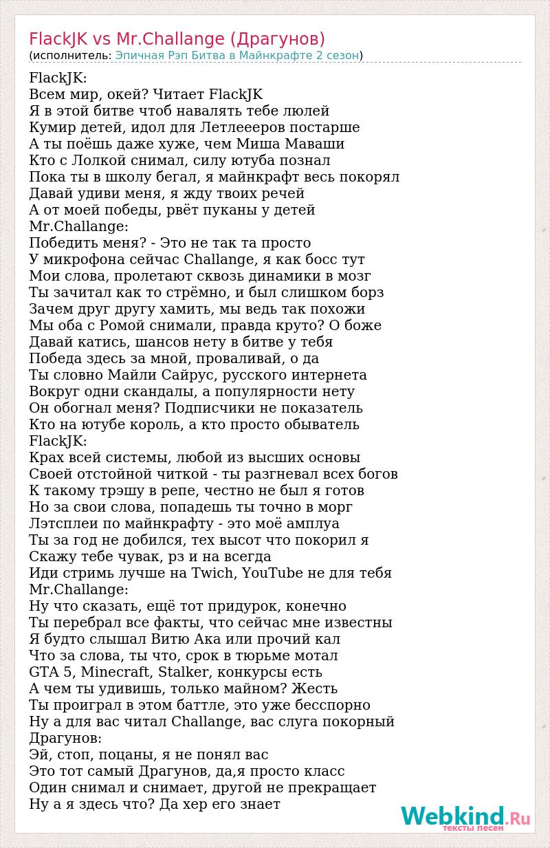FlackJK: Всем мир, окей? Читает FlackJK Я в этой битве чтоб навалять тебе люлей Кумир детей, идол для Летлеееров постарше А ты поёшь даже хуже, чем Миша Маваши Кто с Лолкой снимал, силу ютуба познал Пока ты в школу бегал, я майнкрафт весь покорял Давай удиви меня, я жду твоих речей А от моей победы, рвёт пуканы у детей Mr.Challange: Победить меня? - Это не так та просто У микрофона сейчас Challange, я как босс тут Мои слова, пролетают сквозь динамики в мозг Ты зачитал как то стрёмно, и был слишком борз Зачем друг другу хамить, мы ведь так похожи Мы оба с Ромой снимали, правда круто? О боже Давай катись, шансов нету в битве у тебя Победа здесь за мной, проваливай, о да Ты словно Майли Сайрус, русского интернета Вокруг одни скандалы, а популярности нету Он обогнал меня? Подписчики не показатель Кто на ютубе король, а кто просто обыватель FlackJK: Крах всей системы, любой из высших основы Своей отстойной читкой - ты разгневал всех богов К такому трэшу в репе, честно не был я готов Но за свои слова, попадешь ты точно в морг Лэтсплеи по майнкрафту - это моё амплуа Ты за год не добился, тех высот что покорил я Скажу тебе чувак, рз и на всегда Иди стримь лучше на Twich, YouTube не для тебя Mr.Challange: Ну что сказать, ещё тот придурок, конечно Ты перебрал все факты, что сейчас мне известны Я будто слышал Витю Ака или прочий кал Что за слова, ты что, срок в тюрьме мотал GTA 5, Minecraft, Stalker, конкурсы есть А чем ты удивишь, только майном? Жесть Ты проиграл в этом баттле, это уже бесспорно Ну а для вас читал Challange, вас слуга покорный Драгунов: Эй, стоп, поцаны, я не понял вас Это тот самый Драгунов, да,я просто класс Один снимал и снимает, другой не прекращает Ну а я здесь что? Да хер его знает