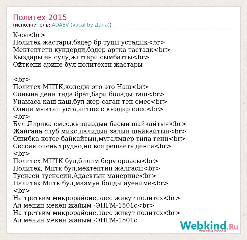 К-сы<br> Политех жастары,бздер бр туды устадык<br> Мектептеги кундерди,бздер артка тастадк<br> Кыздары ен сулу,жгттери сымбатты<br> Ойткени арине бул политехтн жастары <br> Политех МПТК,коледж это это Наш<br> Сонына дейн тнда брат,бари болады таш<br> Унамаса каш каш,бул жер саган тен емес<br> Ознди мыктап уста,айтпесе кыздар елес<br> <br> Бул Лирика емес,кыздардын басын шайкайтын<br> Жайгана слуб микс,палидын залын шайкайтын<br> Ошибка кетсе байкайтын,мугалмдер типа гени<br> Сессия очень трудно,но все решаеть денги<br> <br> Политех МПТК бул,билим беру ордасы<br> Политех, Мптк бул,мектептин жалгасы<br> Туснсен туснесин,Адаевтын манерине<br> Палитех Мптк бул,мазмун болды ауениме<br> <br> На третьим микрорайоне,здес живут политех<br> Ал менин мекен жайым -ЭНГМ-1501с<br> На третьим микрорайоне,здес живут политех<br> Ал менин мекен жайым -ЭНГМ-1501с