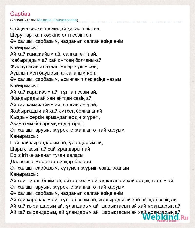 Сайдың серке тасындай қатар тізілген, Шеру тартқан көркіне елін сезінген Ән салшы, сарбазым, назданып салған өзіңе әнім Қайырмасы: Ай хай қамажайым ай, салған әнің ай, жабырқадым ай хай күтсең болғаны-ай Жалаулаған алаулап жігер күшім сен, Ауылың мен бауырың аңсағаным мен. Ән салшы, сарбазым, ұсынған тілек өзіңе назым Қайырмасы: Ай хай қара көзім ай, тұнған сезім ай, Жандырады ай хай айтқан сөзің ай Ай хай қамажайым ай, салған әнің ай, Жабырқадым ай хай күтсең болғаны-ай Қыздың серкін армандап ердің жүрегі, Азаматым боларсың елдің тірегі. Ән салшы, аруым, жүректе жанған оттай қаруым Қайырмасы: Пай пай қырандарым ай, ұландарым ай, Шарықтасын ай хай ұрандарың ай Ер жігітке аманат туған даласы, Даласына жарасар сұңқар баласы Ән салшы, сарбазым, күтумен жүрмін өзіңді жаным Қайырмасы: Ай хай тұран белім ай, айтар келім ай, аялаған ай хай ардақты елім ай Ән салшы, аруым, жүректе жанған оттай қаруым Ән салшы, сарбазым, назданып салған өзіңе әнім Ай хай қара көзім ай, тұнған сезім ай, жадырады ай хай айтқан сөзің ай Ай хай қырандарым ай, ұландарым ай, шарықтасын ай хай ұрандарың ай Ай хай қырандарым, ай ұландарым ай, шарықтасын ай хай ұрандарың ай