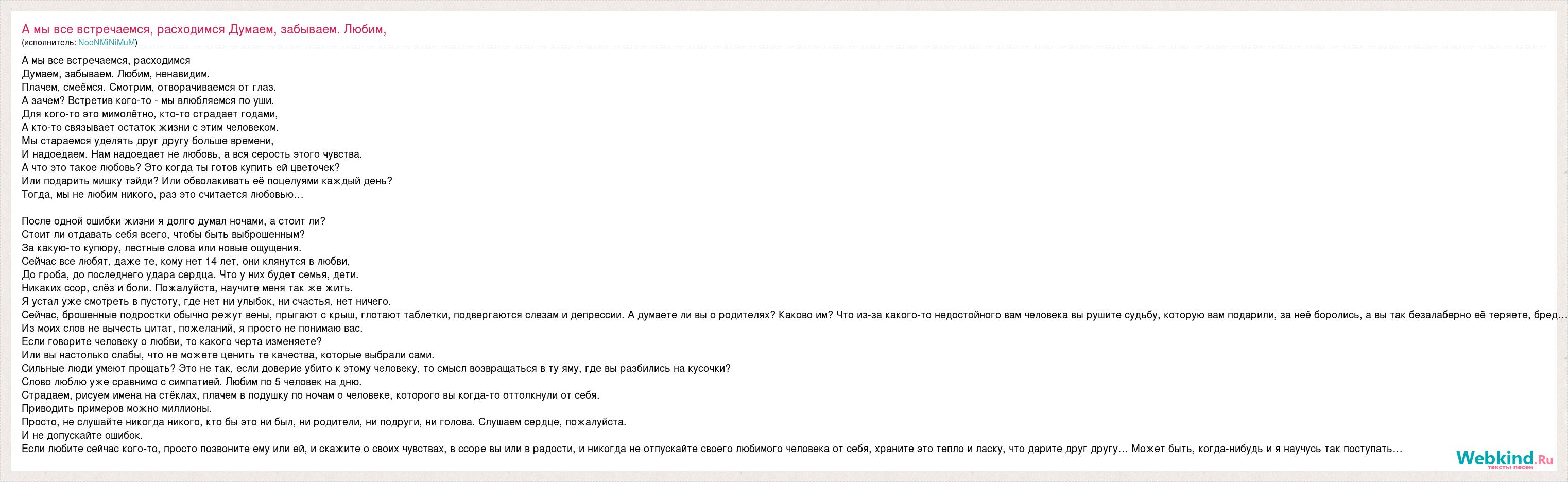 Главная→Исполнители→NooNMiNiMuM→А мы все встречаемся, расходимся Думаем, забываем. Любим, ненавидим. Пла