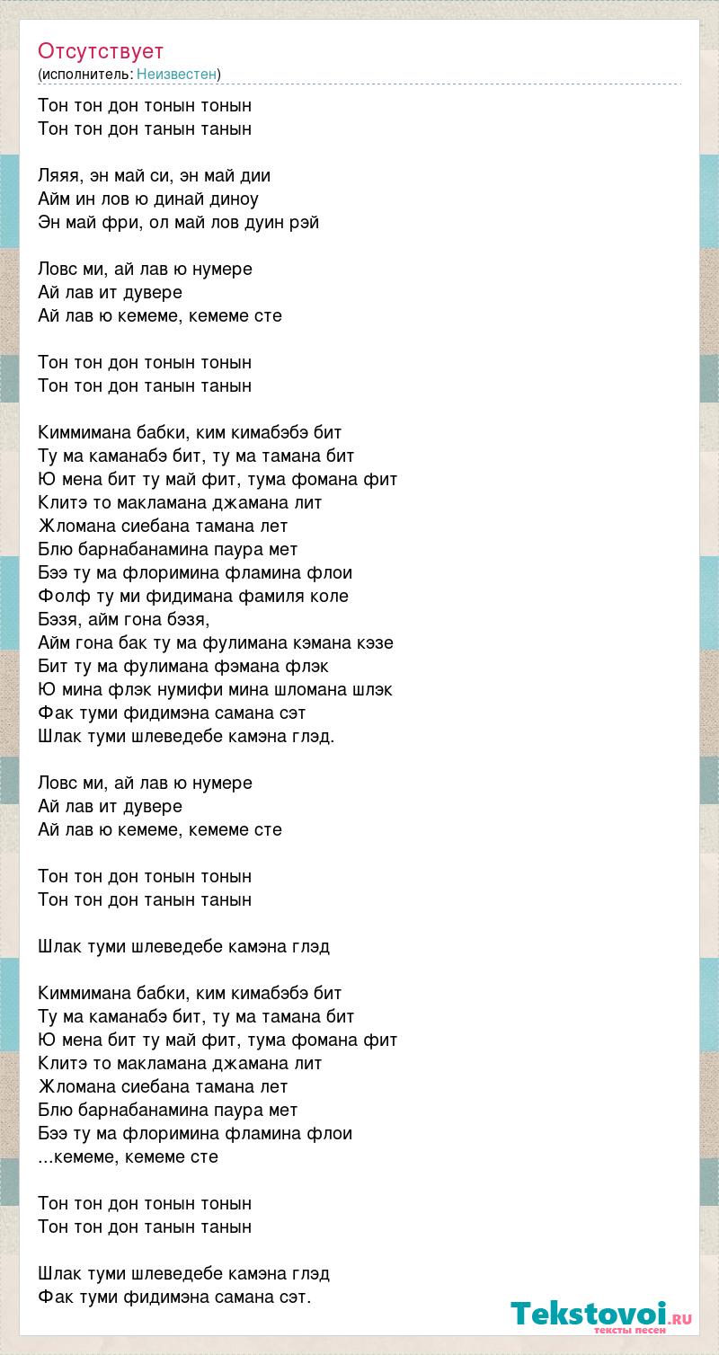 Тон тон дон тонын тонын Тон тон дон танын танын Ляяя, эн май си, эн май дии Айм ин лов ю динай диноу Эн май фри, ол май лов дуин рэй Ловс ми, ай лав ю нумере Ай лав ит дувере Ай лав ю кемеме, кемеме сте Тон тон дон тонын тонын Тон тон дон танын танын Киммимана бабки, ким кимабэбэ бит Ту ма каманабэ бит, ту ма тамана бит Ю мена бит ту май фит, тума фомана фит Клитэ то макламана джамана лит Жломана сиебана тамана лет Блю барнабанамина паура мет Бээ ту ма флоримина фламина флои Фолф ту ми фидимана фамиля коле Бэзя, айм гона бэзя, Айм гона бак ту ма фулимана кэмана кэзе Бит ту ма фулимана фэмана флэк Ю мина флэк нумифи мина шломана шлэк Фак туми фидимэна самана сэт Шлак туми шлеведебе камэна глэд. Ловс ми, ай лав ю нумере Ай лав ит дувере Ай лав ю кемеме, кемеме сте Тон тон дон тонын тонын Тон тон дон танын танын Шлак туми шлеведебе камэна глэд Киммимана бабки, ким кимабэбэ бит Ту ма каманабэ бит, ту ма тамана бит Ю мена бит ту май фит, тума фомана фит Клитэ то макламана джамана лит Жломана сиебана тамана лет Блю барнабанамина паура мет Бээ ту ма флоримина фламина флои ...кемеме, кемеме сте Тон тон дон тонын тонын Тон тон дон танын танын Шлак туми шлеведебе камэна глэд Фак туми фидимэна самана сэт.
