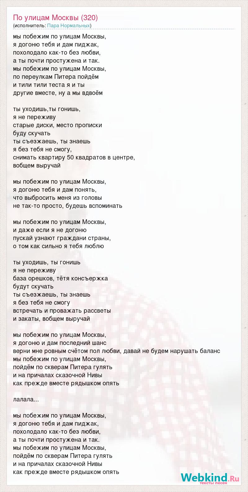 мы побежим по улицам Москвы, я догоню тебя и дам пиджак, похолодало как-то без любви, а ты почти простужена и так. мы побежим по улицам Москвы, по переулкам Питера пойдём и тили тили теста я и ты другие вместе, ну а мы вдвоём ты уходишь,ты гонишь, я не переживу старые диски, место прописки буду скучать ты съезжаешь, ты знаешь я без тебя не смогу, снимать квартиру 50 квадратов в центре, вобщем выручай мы побежим по улицам Москвы, я догоню тебя и дам понять, что выбросить меня из головы не так-то просто, будешь вспоминать мы побежим по улицам Москвы, и даже если я не догоню пускай узнают граждани страны, о том как сильно я тебя люблю ты уходишь, ты гонишь я не переживу база орешков, тётя консъержка будут скучать ты съезжаешь, ты знаешь я без тебя не смогу встречать и проважать рассветы и закаты, вобщем выручай мы побежим по улицам Москвы, я догоню и дам последний шанс верни мне ровным счётом пол любви, давай не будем нарушать баланс мы побежим по улицам Москвы, пойдём по скверам Питера гулять и на причалах сказочной Нивы как прежде вместе рядышком опять лалала... мы побежим по улицам Москвы, я догоню тебя и дам пиджак, похолодало как-то без любви, а ты почти простужена и так. мы побежим по улицам Москвы, пойдём по скверам Питера гулять и на причалах сказочной Нивы как прежде вместе рядышком опять