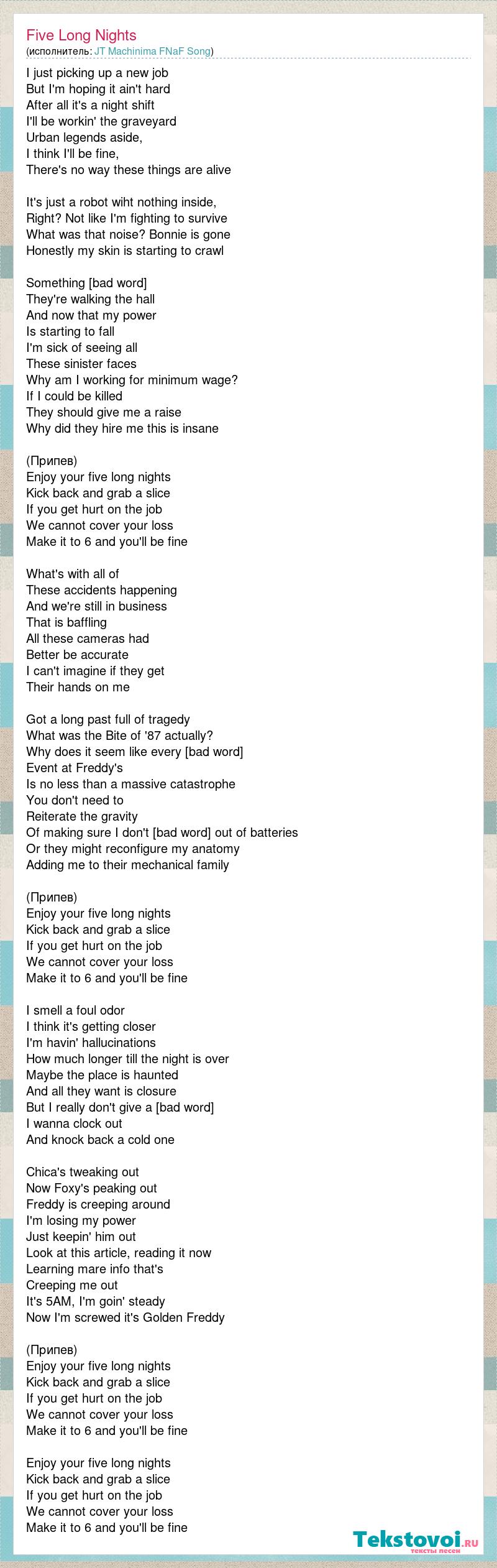 I just picking up a new job But I'm hoping it ain't hard After all it's a night shift I'll be workin' the graveyard Urban legends aside, I think I'll be fine, There's no way these things are alive It's just a robot wiht nothing inside, Right? Not like I'm fighting to survive What was that noise? Bonnie is gone Honestly my skin is starting to crawl Something [bad word] They're walking the hall And now that my power Is starting to fall I'm sick of seeing all These sinister faces Why am I working for minimum wage? If I could be killed They should give me a raise Why did they hire me this is insane (Припев) Enjoy your five long nights Kick back and grab a slice If you get hurt on the job We cannot cover your loss Make it to 6 and you'll be fine What's with all of These accidents happening And we're still in business That is baffling All these cameras had Better be accurate I can't imagine if they get Their hands on me Got a long past full of tragedy What was the Bite of '87 actually? Why does it seem like every [bad word] Event at Freddy's Is no less than a massive catastrophe You don't need to Reiterate the gravity Of making sure I don't [bad word] out of batteries Or they might reconfigure my anatomy Adding me to their mechanical family (Припев) Enjoy your five long nights Kick back and grab a slice If you get hurt on the job We cannot cover your loss Make it to 6 and you'll be fine I smell a foul odor I think it's getting closer I'm havin' hallucinations How much longer till the night is over Maybe the place is haunted And all they want is closure But I really don't give a [bad word] I wanna clock out And knock back a cold one Chica's tweaking out Now Foxy's peaking out Freddy is creeping around I'm losing my power Just keepin' him out Look at this article, reading it now Learning mare info that's Creeping me out It's 5AM, I'm goin' steady Now I'm screwed it's Golden Freddy (Припев) Enjoy your five long nights Kick back and grab a slice If you get hurt on the job We cannot cover your loss Make it to 6 and you'll be fine Enjoy your five long nights Kick back and grab a slice If you get hurt on the job We cannot cover your loss Make it to 6 and you'll be fine
