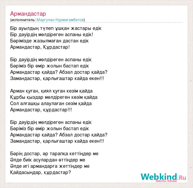 Бір ауылдың түлеп ұшқан жастары едік Бір дәуірдің мөлдіреген аспаны едік! Бәрімізде жазылмаған дастан едік Армандастар, Құрдастар! Бір дәуірдің мөлдіреген аспаны едік Бәріміз бір өмір жолын бастап едік Армандастар қайда? Абзал достар қайда? Замандастар, қарлығаштар кайда екен!!! Арман қуған, қиял қуған кезім қайда Құрбы қыздар мөлдіреген көзім қайда Сол алғашқы алаулаған сезім қайда Армандастар, құрдастар!!! Бір дәуірдің мөлдіреген аспаны едік Бәріміз бір өмір жолын бастап едік Армандастар қайда? Абзал достар қайда? Замандастар, қарлығаштар кайда екен!!! Бәрің достар, әр тарапқа кеттіңдер ме Әлде биік асулардан өттіңдер ме Әлде игі армандарға жеттіңдер ме Қайдасыңдар, құрдастар?