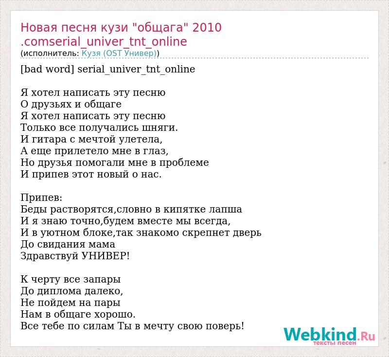 [bad word] serial_univer_tnt_online Я хотел написать эту песню О друзьях и общаге Я хотел написать эту песню Только все получались шняги. И гитара с мечтой улетела, А еще прилетело мне в глаз, Но друзья помогали мне в проблеме И припев этот новый о нас. Припев: Беды растворятся,словно в кипятке лапша И я знаю точно,будем вместе мы всегда, И в уютном блоке,так знакомо скрепнет дверь До свидания мама Здравствуй УНИВЕР! К черту все запары До диплома далеко, Не пойдем на пары Нам в общаге хорошо. Все тебе по силам Ты в мечту свою поверь!
