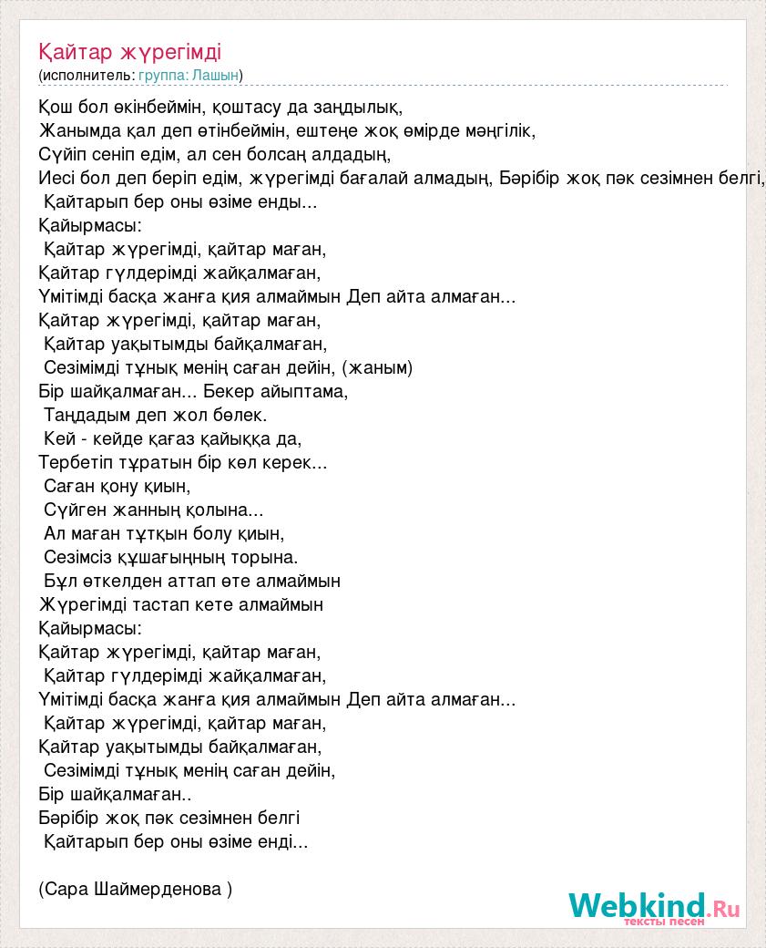 Қош бол өкінбеймін, қоштасу да заңдылық, Жанымда қал деп өтінбеймін, ештеңе жоқ өмірде мәңгілік, Сүйіп сеніп едім, ал сен болсаң алдадың, Иесі бол деп беріп едім, жүрегімді бағалай алмадың, Бәрібір жоқ пәк сезімнен белгі, Қайтарып бер оны өзіме енды... Қайырмасы: Қайтар жүрегімді, қайтар маған, Қайтар гүлдерімді жайқалмаған, Үмітімді басқа жанға қия алмаймын Деп айта алмаған... Қайтар жүрегімді, қайтар маған, Қайтар уақытымды байқалмаған, Сезімімді тұнық менің саған дейін, (жаным) Бір шайқалмаған... Бекер айыптама, Таңдадым деп жол бөлек. Кей - кейде қағаз қайыққа да, Тербетіп тұратын бір көл керек... Саған қону қиын, Сүйген жанның қолына... Ал маған тұтқын болу қиын, Сезімсіз құшағыңның торына. Бұл өткелден аттап өте алмаймын Жүрегімді тастап кете алмаймын Қайырмасы: Қайтар жүрегімді, қайтар маған, Қайтар гүлдерімді жайқалмаған, Үмітімді басқа жанға қия алмаймын Деп айта алмаған... Қайтар жүрегімді, қайтар маған, Қайтар уақытымды байқалмаған, Сезімімді тұнық менің саған дейін, Бір шайқалмаған.. Бәрібір жоқ пәк сезімнен белгі Қайтарып бер оны өзіме енді... (Сара Шаймерденова )