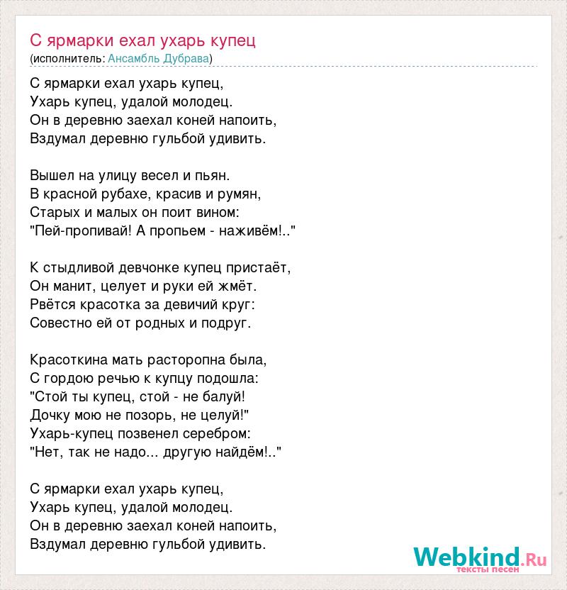 С ярмарки ехал ухарь купец, Ухарь купец, удалой молодец. Он в деревню заехал коней напоить, Вздумал деревню гульбой удивить. Вышел на улицу весел и пьян. В красной рубахе, красив и румян, Старых и малых он поит вином: "Пей-пропивай! А пропьем - наживём!.." К стыдливой девчонке купец пристаёт, Он манит, целует и руки ей жмёт. Рвётся красотка за девичий круг: Совестно ей от родных и подруг. Красоткина мать расторопна была, С гордою речью к купцу подошла: "Стой ты купец, стой - не балуй! Дочку мою не позорь, не целуй!" Ухарь-купец позвенел серебром: "Нет, так не надо... другую найдём!.." С ярмарки ехал ухарь купец, Ухарь купец, удалой молодец. Он в деревню заехал коней напоить, Вздумал деревню гульбой удивить.