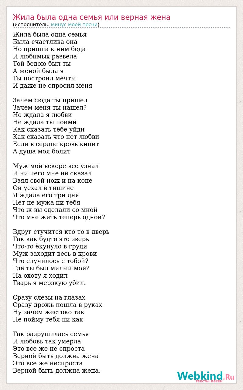 Жила была одна семья Была счастлива она Но пришла к ним беда И любимых развела Той бедою был ты А женой была я Ты построил мечты И даже не спросил меня Зачем сюда ты пришел Зачем меня ты нашел? Не ждала я любви Не ждала ты пойми Как сказать тебе уйди Как сказать что нет любви Если в сердце кровь кипит А душа моя болит Муж мой вскоре все узнал И ни чего мне не сказал Взял свой нож и на коне Он уехал в тишине Я ждала его три дня Нет не мужа ни тебя Что ж вы сделали со мной Что мне жить теперь одной? Вдруг стучится кто-то в дверь Так как будто это зверь Что-то ёкунуло в груди Муж заходит весь в крови Что случилось с тобой? Где ты был милый мой? На охоту я ходил Тварь я мерзкую убил. Сразу слезы на глазах Сразу дрожь пошла в руках Ну зачем жестоко так Не пойму тебя ни как Так разрушилась семья И любовь так умерла Это все же не спроста Верной быть должна жена Это все же неспроста Верной быть должна жена.